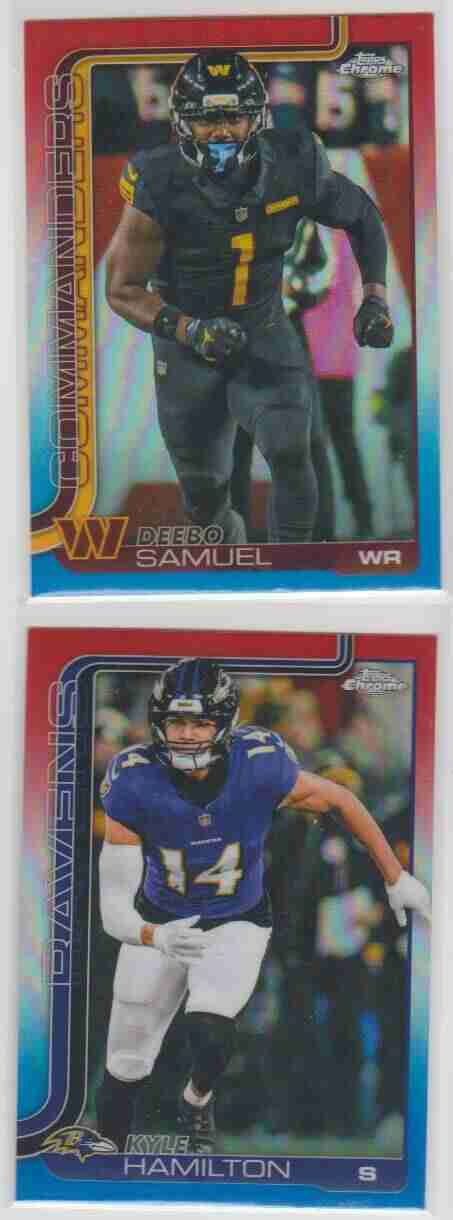 Please take a look at the photos for details on the cards' condition. The cards you are bidding on are the cards pictured. This auction is for 2 2025 Topps Chrome Red/White/Blue parallels. They are #29 Kyle Hamilton and #294 Deebo Samuel. You can use your judgment on the grade of the cards. If you have any questions or require more detailed photos, please don't hesitate to ask. Note: The shipping price shown is for PWE. The card will ship with a tracking number if the final auction price exceeds a certain dollar amount (or if it is combined with the appropriate number of other completed auctions). Otherwise, the card will be shipped PWE. Thank you!