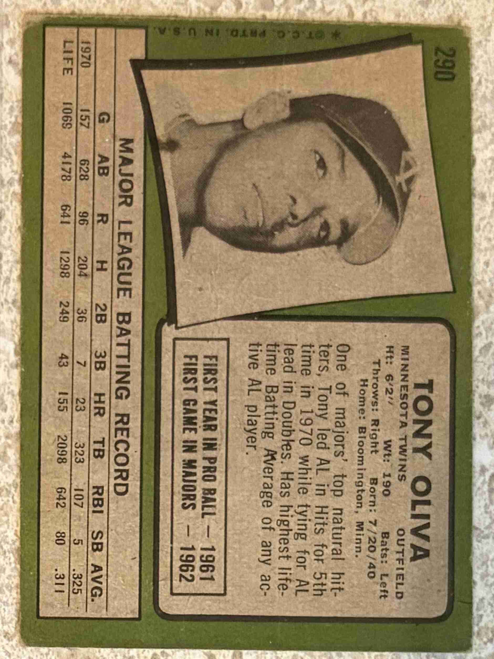 1971 Topps Baseball Tony Oliva #290 Fair condition. Shipped in PWE