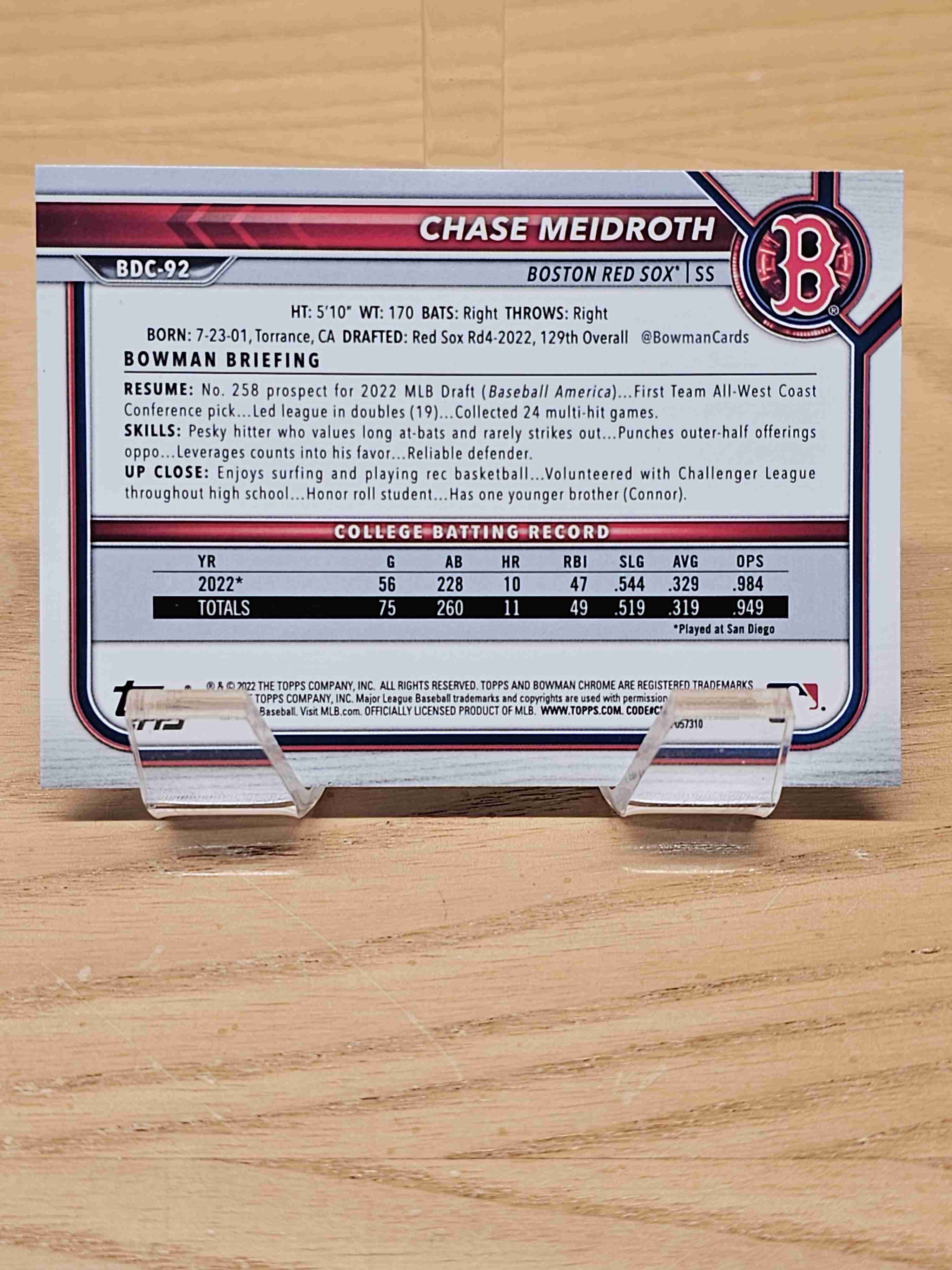 2022 Bowman Chrome Baseball 1st Bowman Draft Chase Meidroth Boston Red Sox Card #BDC-92