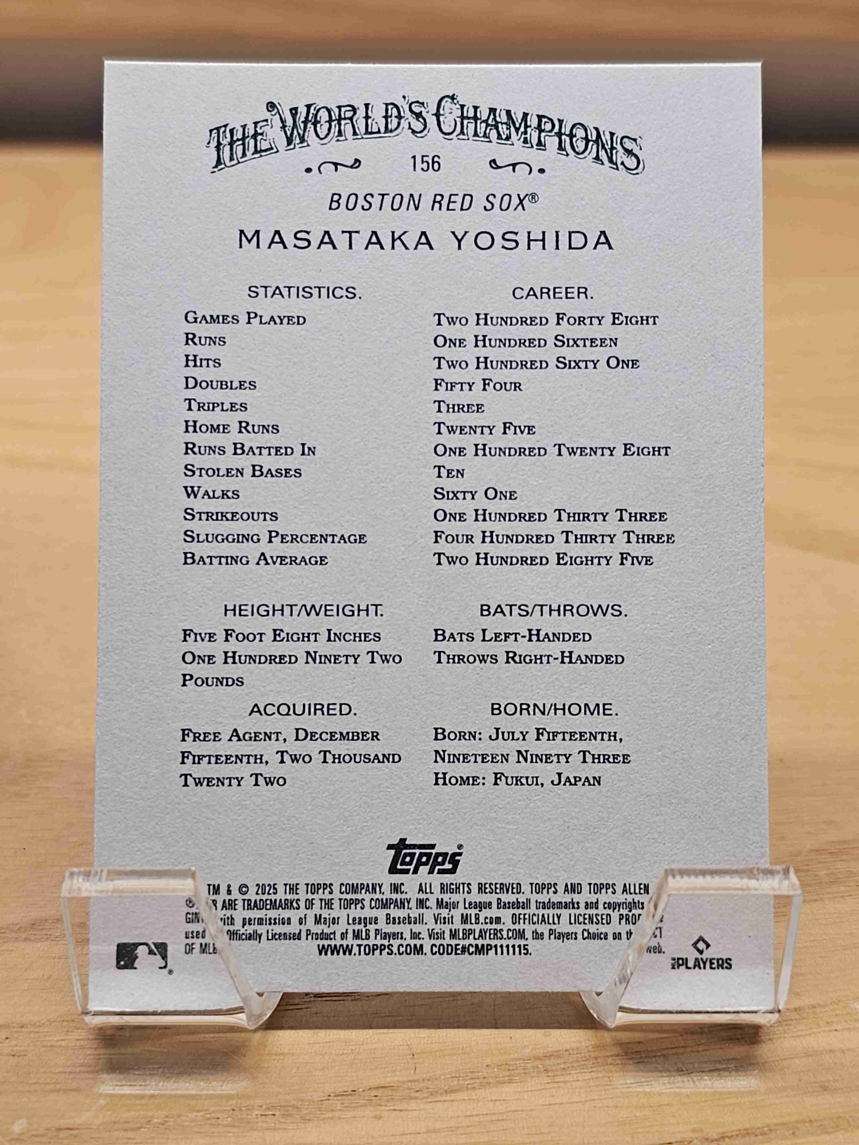 2025 Topps Allen & Ginter Baseball Masataka Yoshida Boston Red Sox Card #156