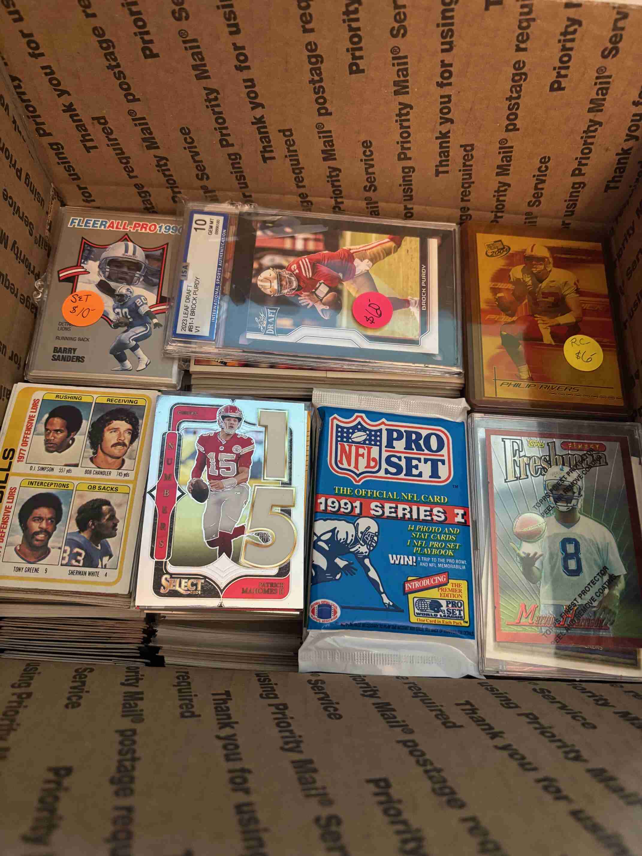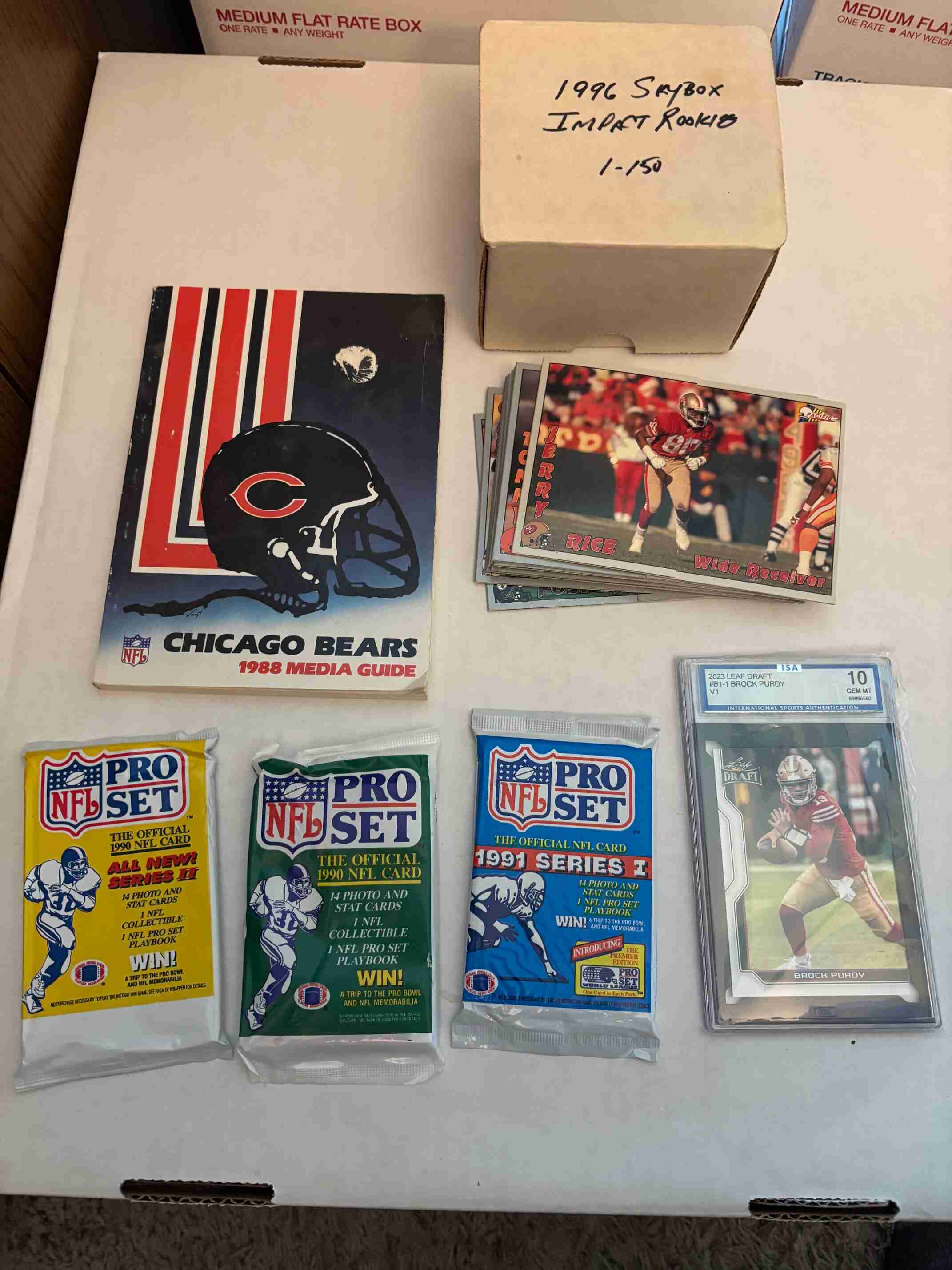 Huge clearance collection of 2500 Football cards featuring a Gem Mint Brock Purdy 10, a 1996 set, a rare 1988 Chicago Bears Media Guide, and loaded with high value vintage, rookies, stars, and unopened packs, all in great condition. You will receive everything shown in the photos and more. I am having a complete clearance of my 2,000,000 card collection so please check out my other auctions for more great deals.