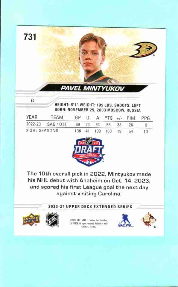 Pavel Mintyukov #731 Rookie – 2023-24 Upper Deck Extended S