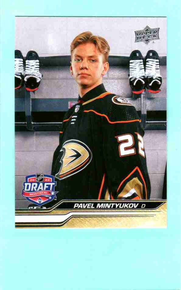 Official rookie card of Pavel Mintyukov featuring his 2022 NHL Draft design. Clean layout with strong eye appeal, highlighting one of the Ducks’ promising young defensemen.