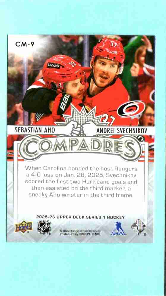 Sebastian Aho / Andrei Svechnikov #CM-9 Compadres – 2025-26 Upper Deck Series 1 (Carolina Hurricanes)