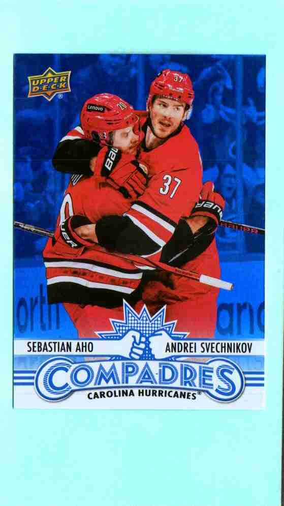 Fun “Compadres” insert featuring teammates Sebastian Aho and Andrei Svechnikov celebrating together. Bright blue parallel-style design with strong visual appeal—great combo card for Hurricanes fans and NHL collectors.