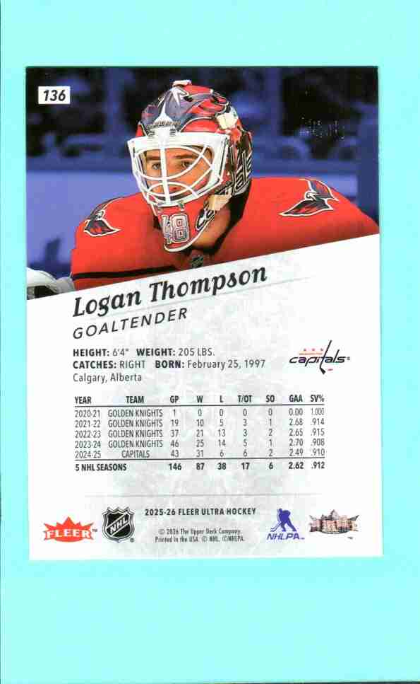 Logan Thompson #136 – 2025-26 Fleer Ultra (Washington Capitals) Clean Fleer Ultra card of goaltender Logan Thompson featuring a classic action pose and sharp Ultra design.