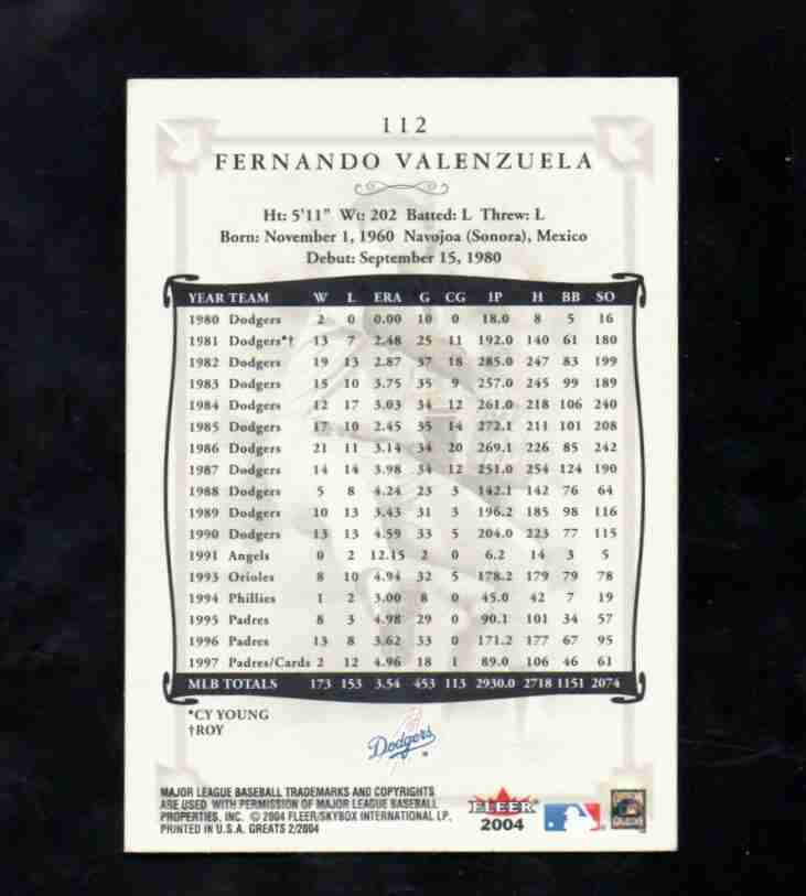 2004 Fleer Greats of the Game # 112 FERNANDO VALENZUELA