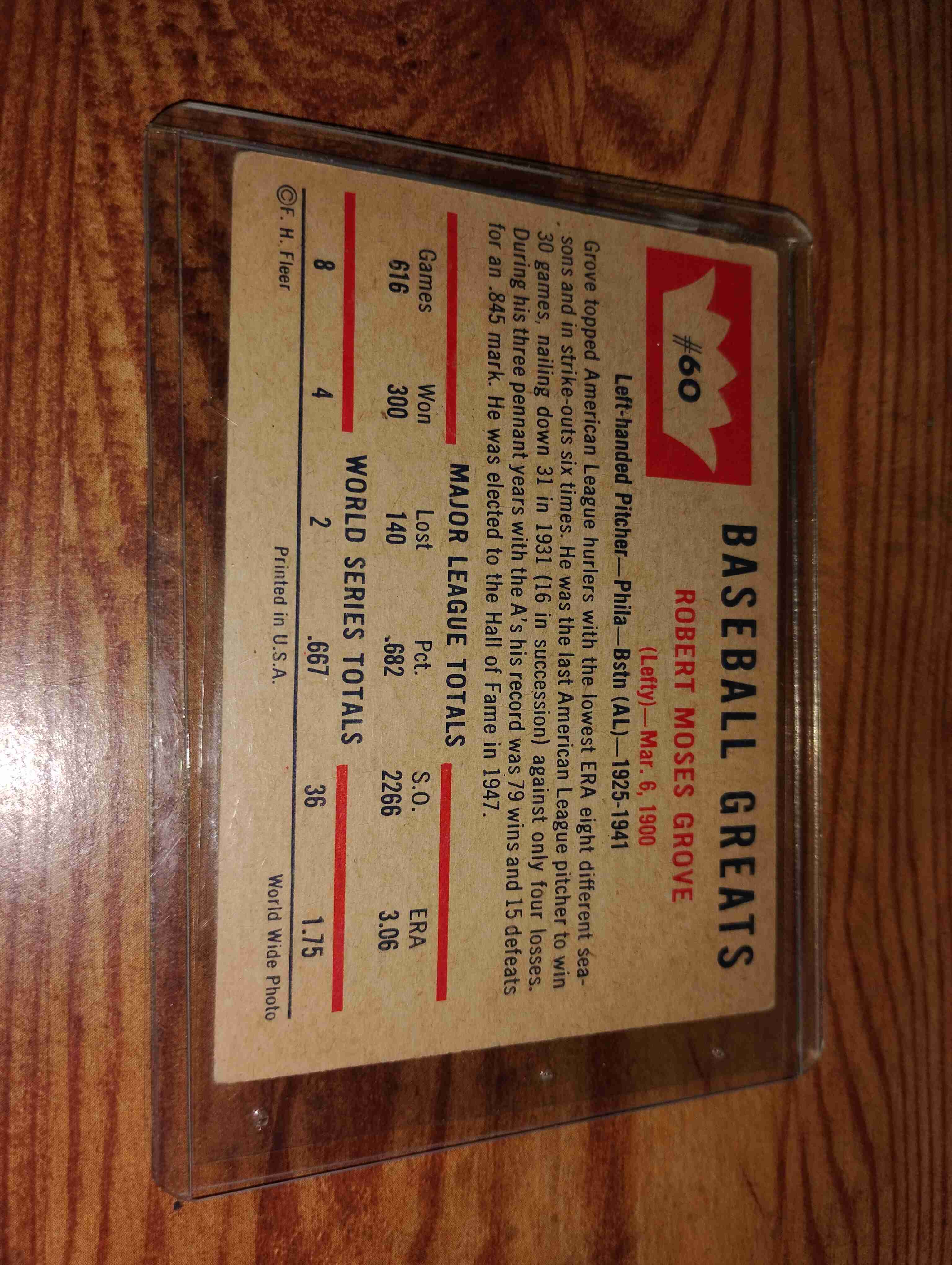 CARD IS PICTURED IN A HARD PLASTIC SLEEVE.VERY NICE LOOKING VINTAGE CARD OF 300 GAME WINNER AND HALL OF FAMER LEFTY GROVE.