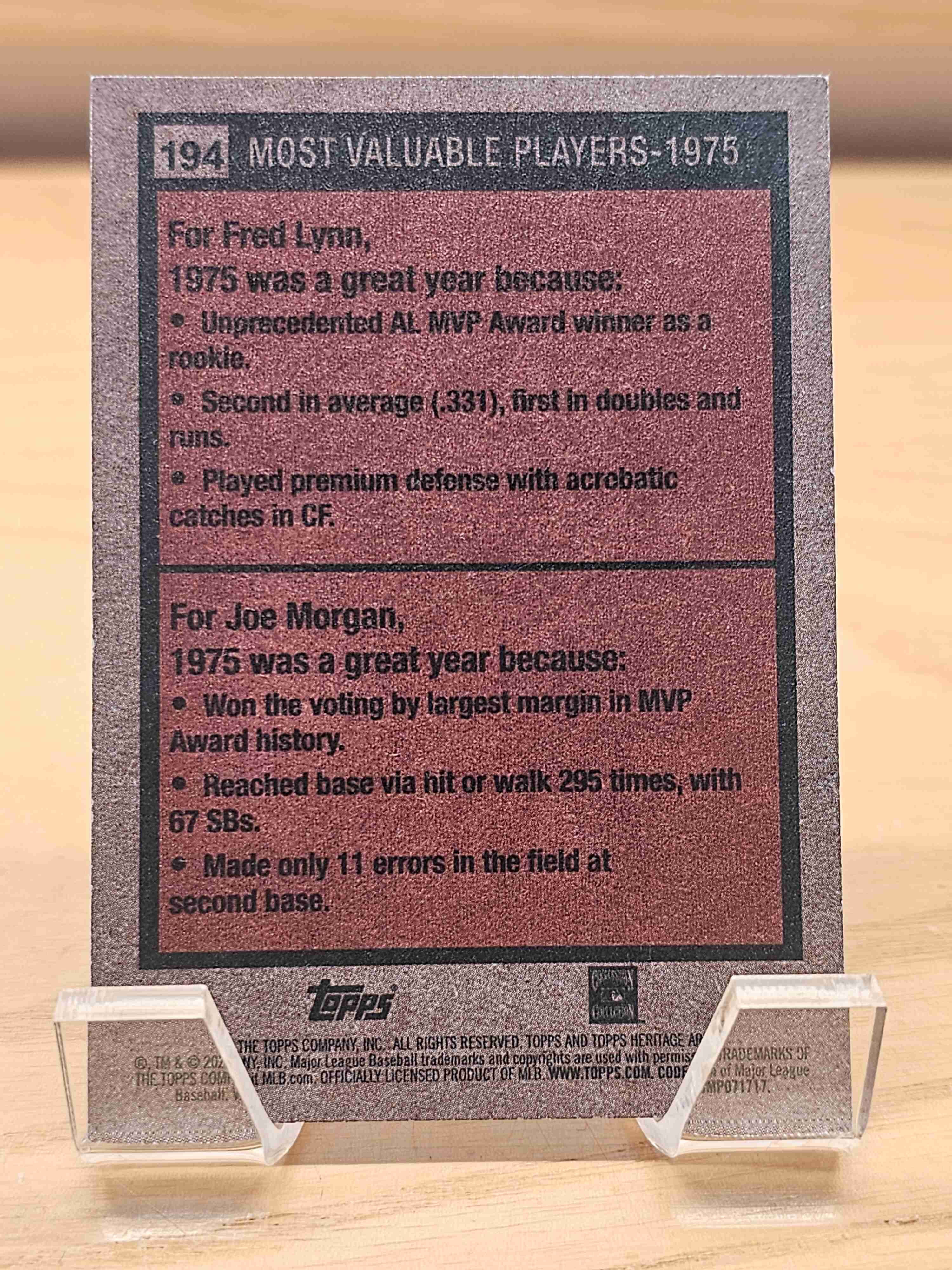 2024 Topps Heritage Baseball 1975 Most Valuable Players Fred Lynn Joe Morgan Boston Red Sox Cincinnati Reds Card #194