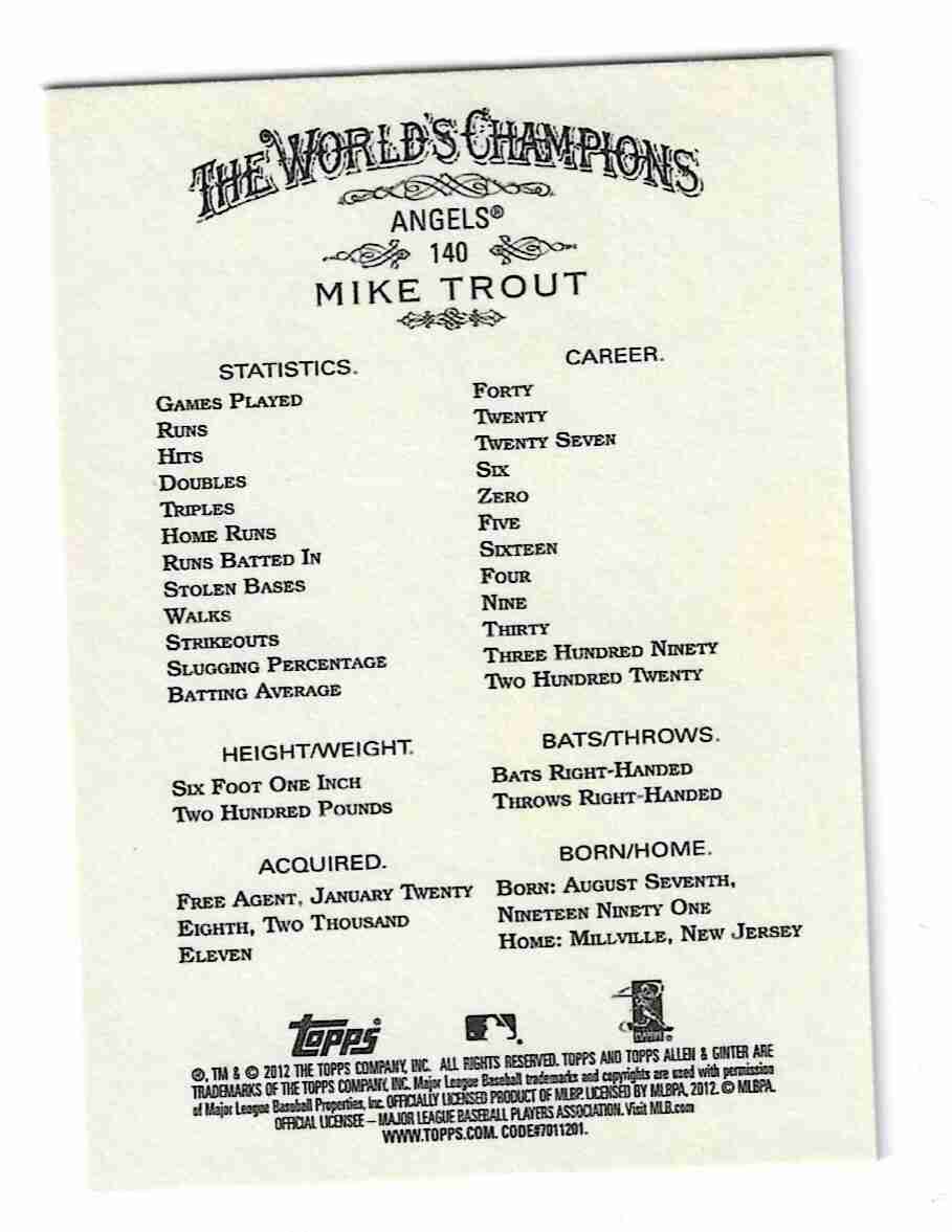 Trout 2012 Allen & Ginter second Year. Card is number 140 in the set. Mailed in standard envelope. Thanks for bidding!