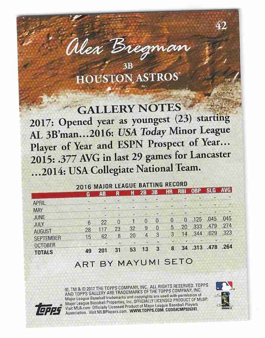 Bregman 2017 Topps Gallery RC. Card is number 42 in the set. Mailed in standard envelope. Thanks for bidding!