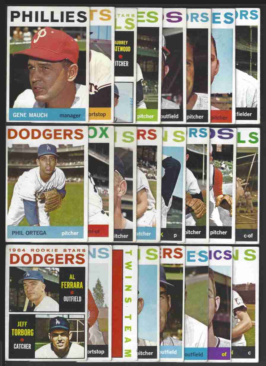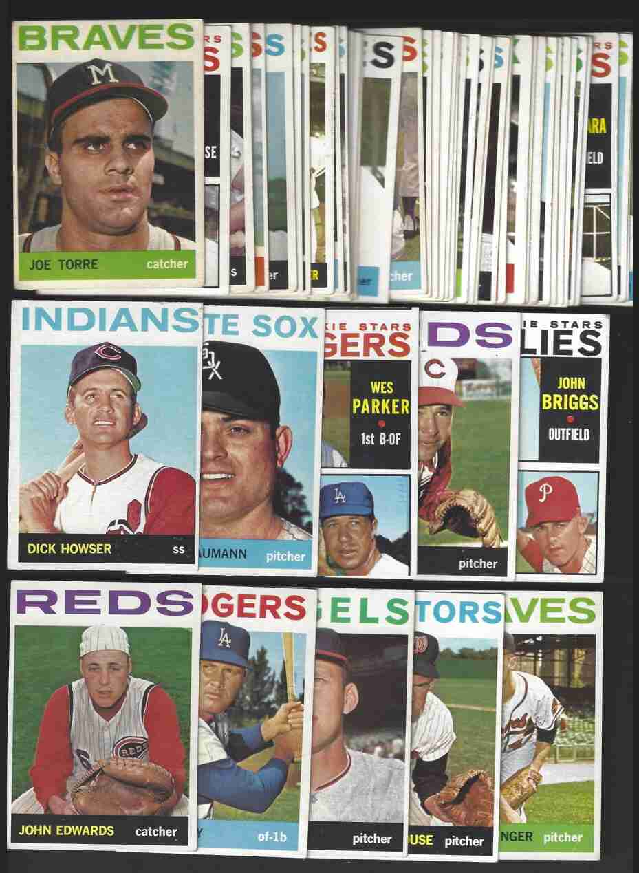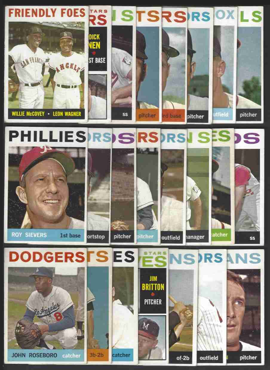 1964 Topps Baseball Lot (56). Low Series (46) #14,15,18,19,28,31,32,41,43,46, 49,51,52,54,70,72,82,83,88,94,105,114,122,123,127,152,157,166,187,209,217, 228,245,249,258,261,275,291,296,301,318,337,341,353,364,366,369. Semi-Hi No's (9) -#453,456,478,480,482,490,493,498,507. Hi No. (1) -#575. Nice lot of 1964 Topps Baseball cards. Lot includes scarce semi-hi and hi numbers. Cards are in the mid to higher-grade range - light corner wear. Overall, nice shape for this era. Please review scans carefully for condition.
