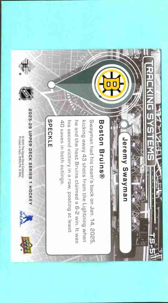 Jeremy Swayman #TS-5 – 2025-26 Upper Deck “Tracking Systems” (Speckle Parallel)