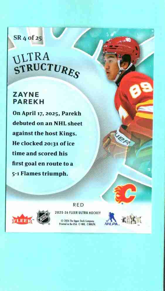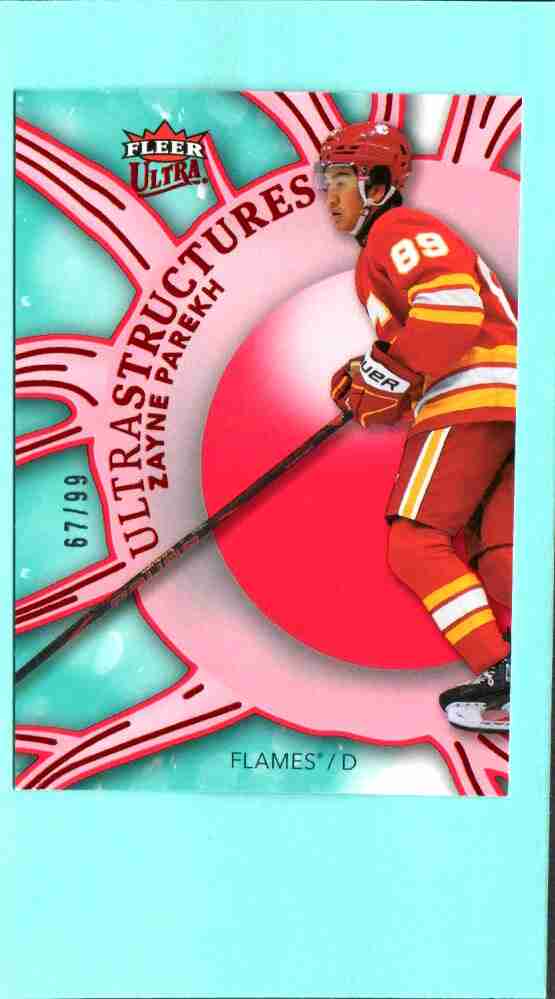 Eye-catching insert of Zayne Parekh (Calgary Flames). This is the Red parallel numbered 67/99, a limited short-print from the Ultra Structures set with bold design and strong prospect appeal.