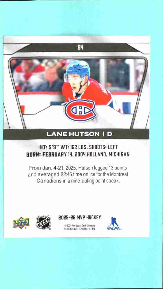 Lane Hutson #84 – 2025-26 Upper Deck MVP (Montreal Canadiens)