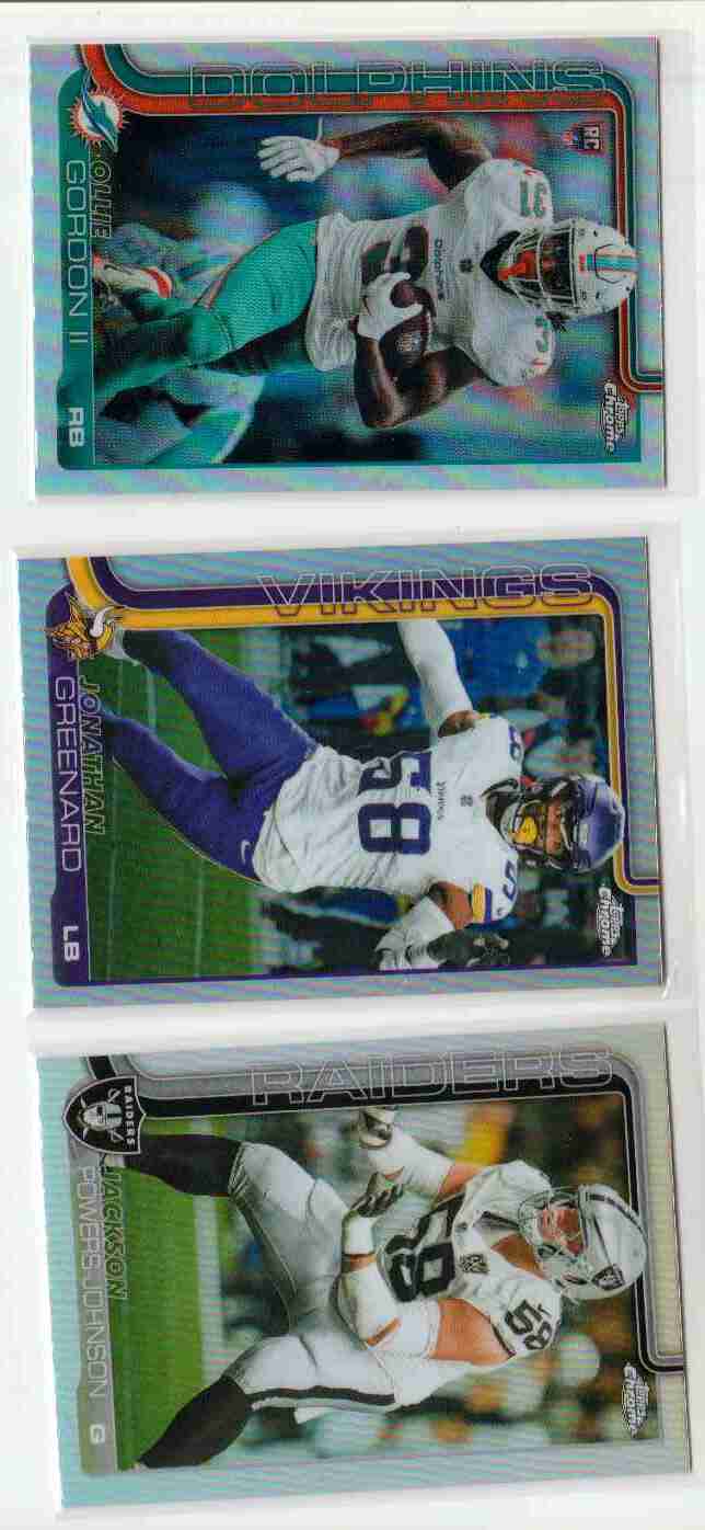 Please take a look at the photos for details on the cards' condition. The cards you are bidding on are the cards pictured. This auction is for 3 2025 Topps Chrome Football Refractors. View the image for a complete listing. You can use your judgment on the grade of the cards. If you have any questions or require more detailed photos, please don't hesitate to ask. Note: The shipping price shown is for PWE. The card will ship with a tracking number if the final auction price exceeds a certain dollar amount (or if it is combined with the appropriate number of other completed auctions). Otherwise, the card will be shipped PWE. Thank you!
