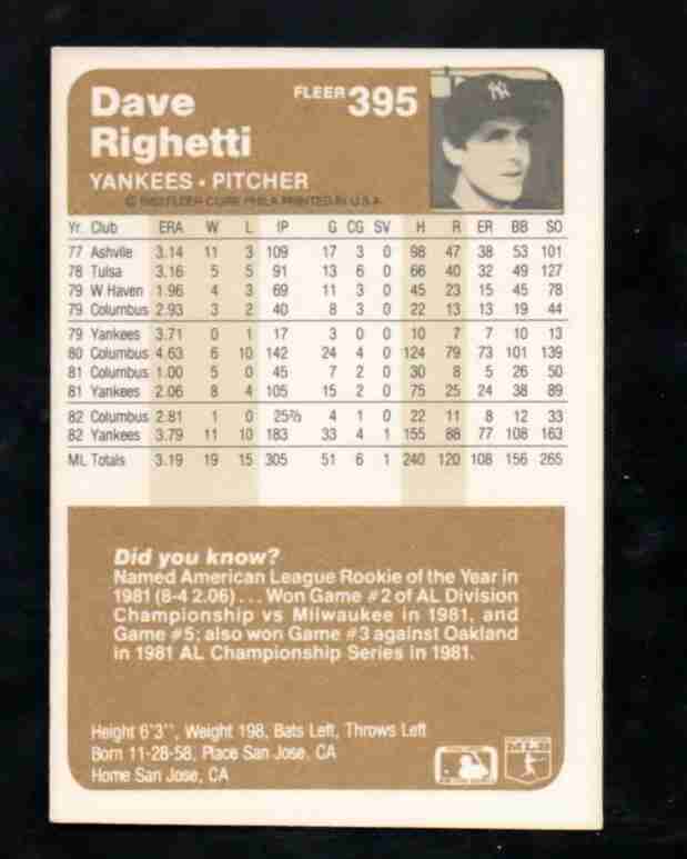 1983 Fleer # 395 DAVE RIGHETTI NY Yankees NM/M