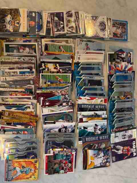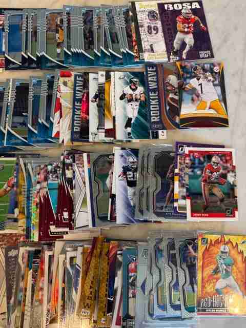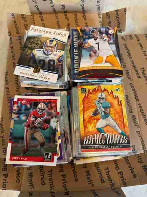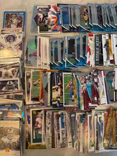 HUGE 265++ FLAT RATE BOX CARD LOT* FOOTBALL RCs/STARS/MORE+ - counted and approximately 265 cards.. just picked these up in a collection i purchased and selling them all here at once - a whole dealer lot full of rookies, inserts, base cards, parallels, hof cards + more spanning from the past few years and back. Shipped all team bagged in a priority small flat rate box. EVERY CARD PICTURED IS INCLUDED - so please check the pics for every card you will receive!