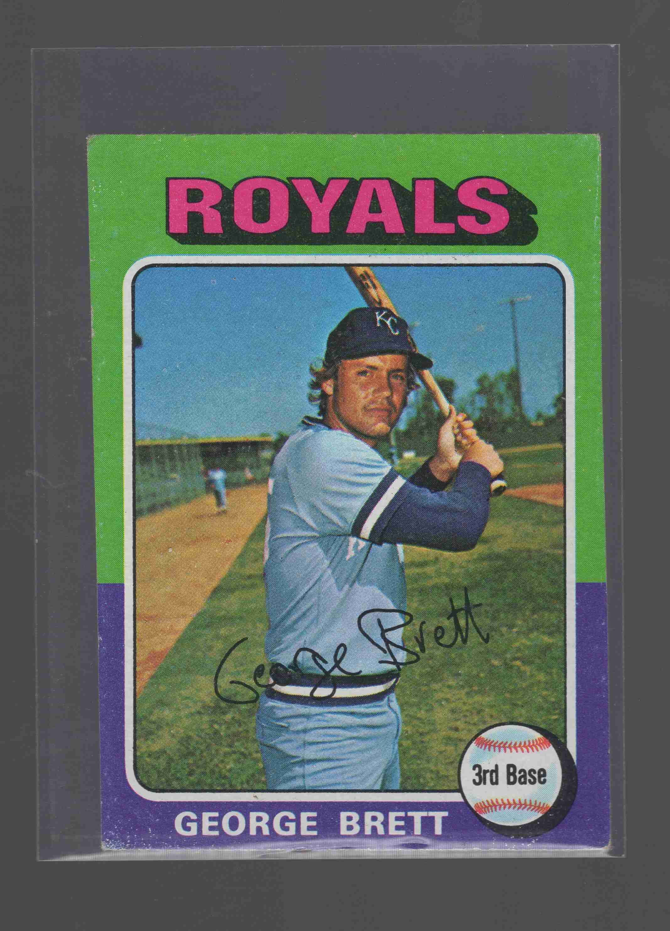 George Brett 1975 Topps Mini RC #228. Card is crease free but does have some corner and surface wear. Ships bubble mailer with tracking.