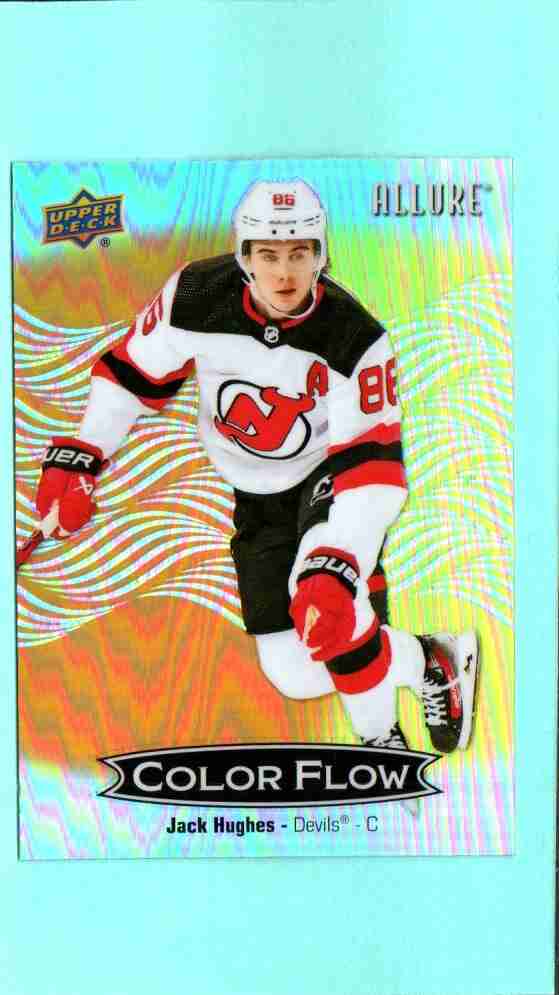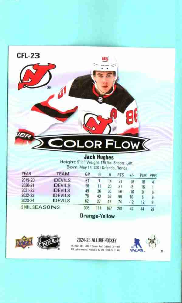 Jack Hughes CFL-23 Color Flow Orange-Yellow 2024-25 Upper Deck Allure Hockey. Bright foil insert featuring Devils star center. Card is in Near Mint to Mint condition with clean surface, sharp edges, and strong eye appeal. Ships securely with protection.