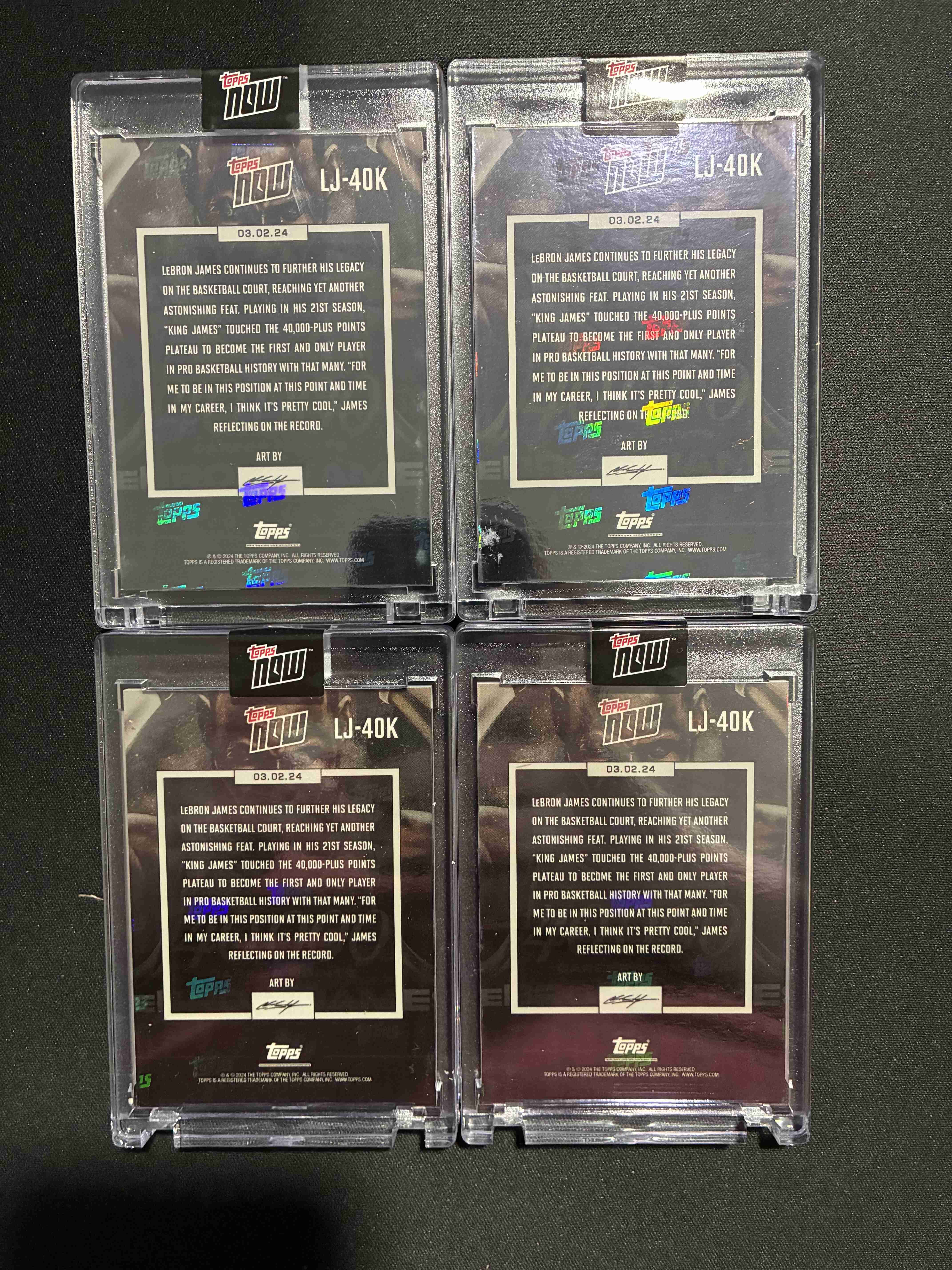 You are bidding on a 4 card encased lot of 2024 Topps NOW LeBron James cards commemorating his 40,000th point. Cards will be shipped in one touch cases with original sticker seals as shown. These are a great add to any collection. Please ask any questions before bidding.