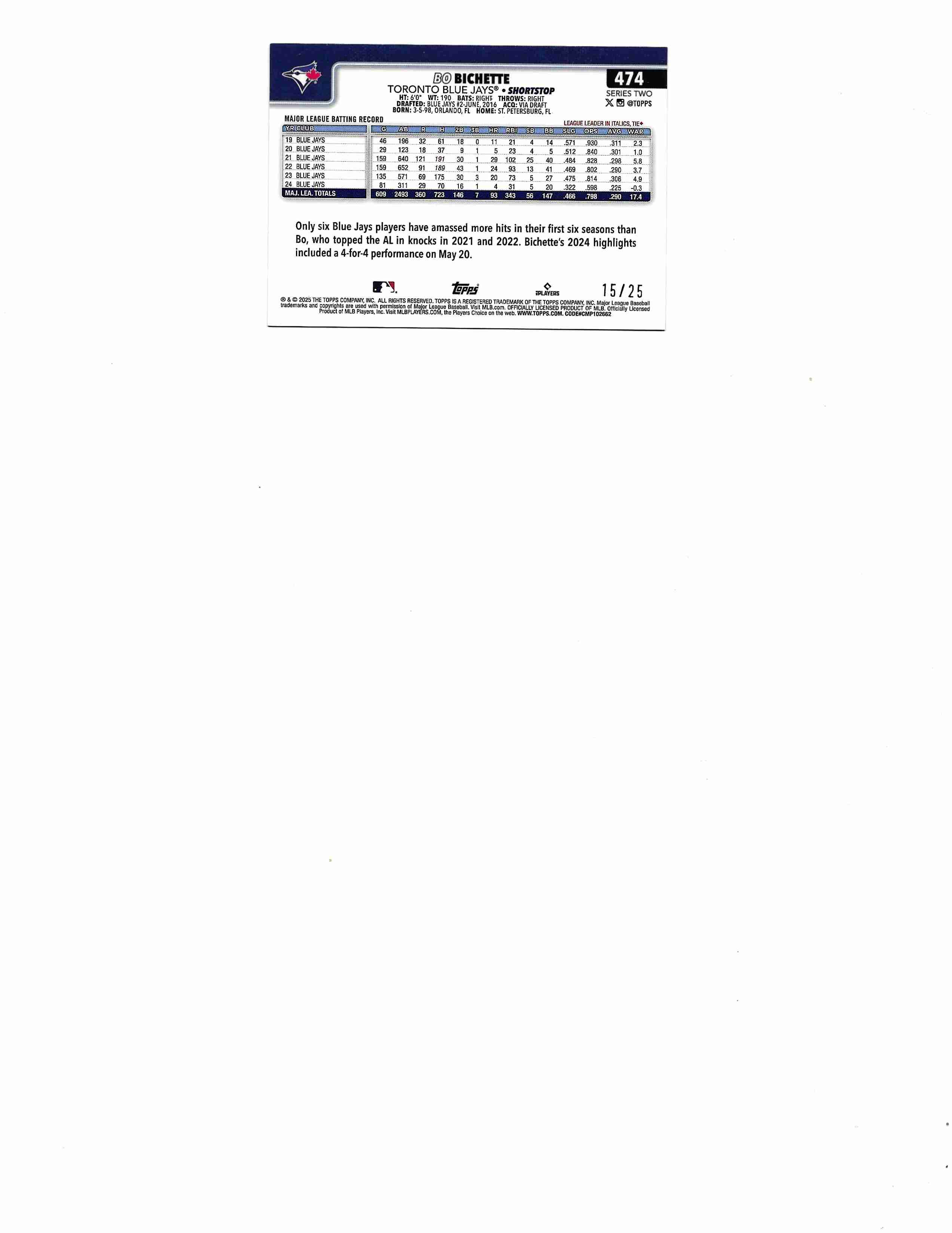 2025 TOPPS BO BICHETTE ORANGE AROUND CARD #15/25 BLUE JAYS. CARD IN EXCELLENT CONDITION. 315/25