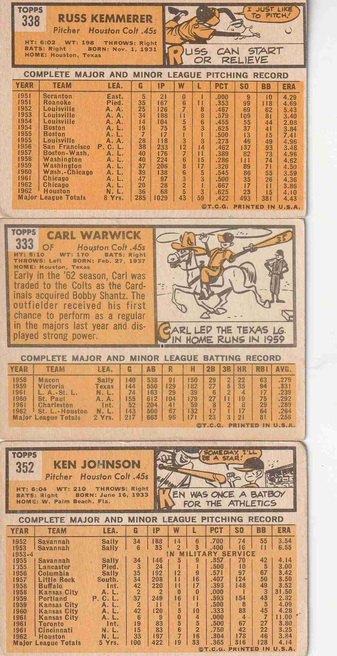 #333 Carl Warwick (EX) #338 Russ Kemmerer (VG+/EX) several mild blemishes #352 Ken Johnson (Fair)