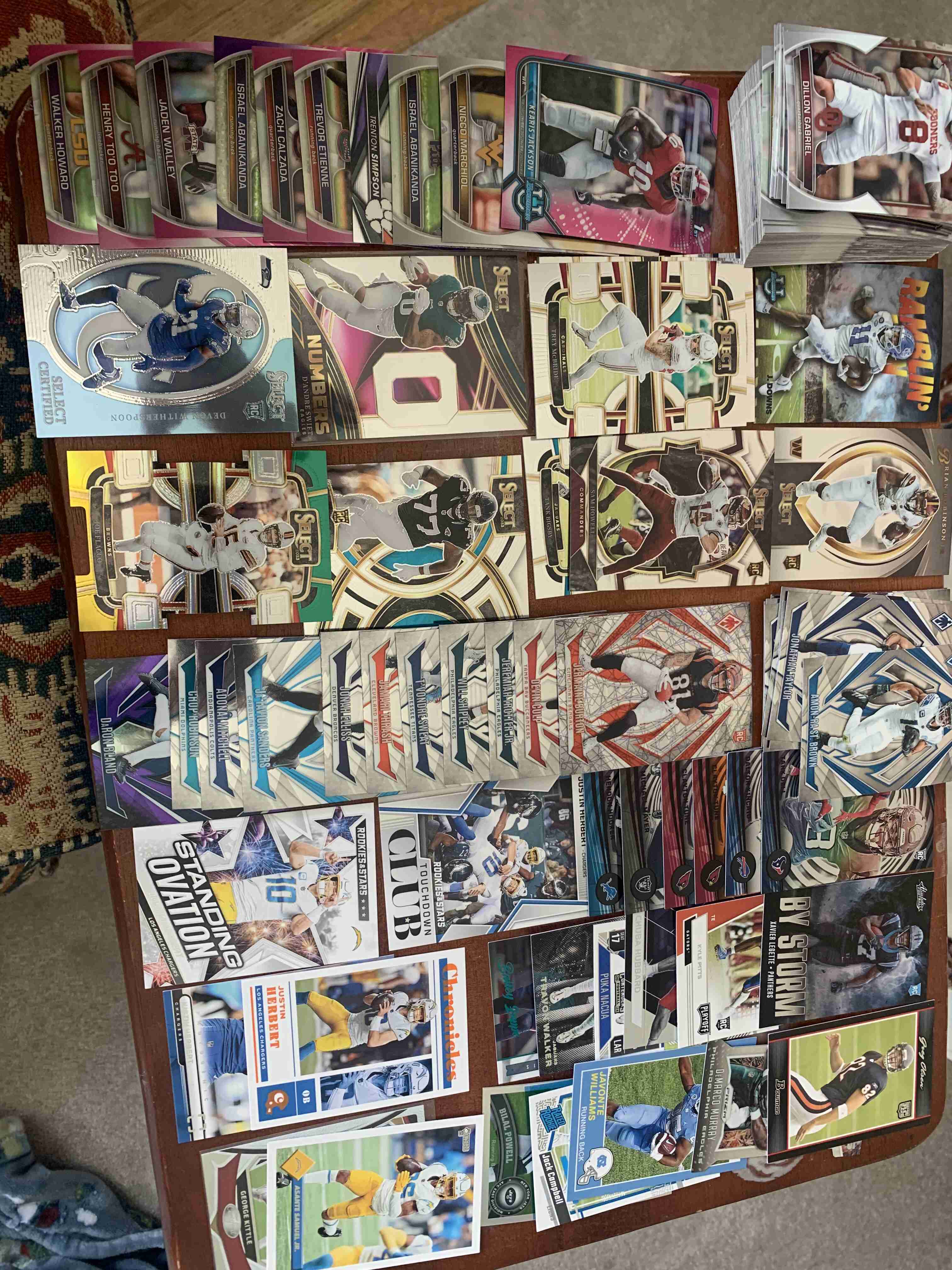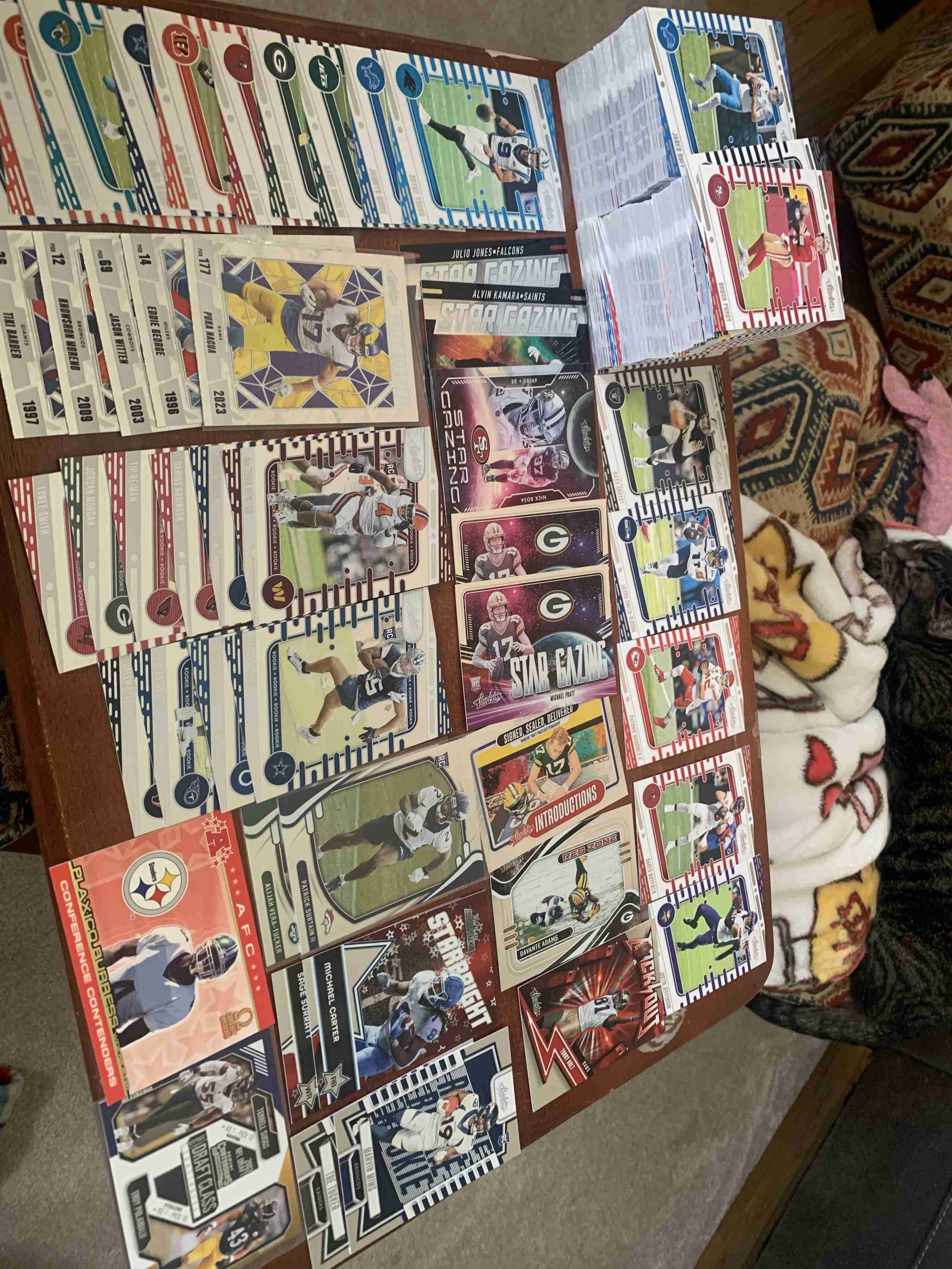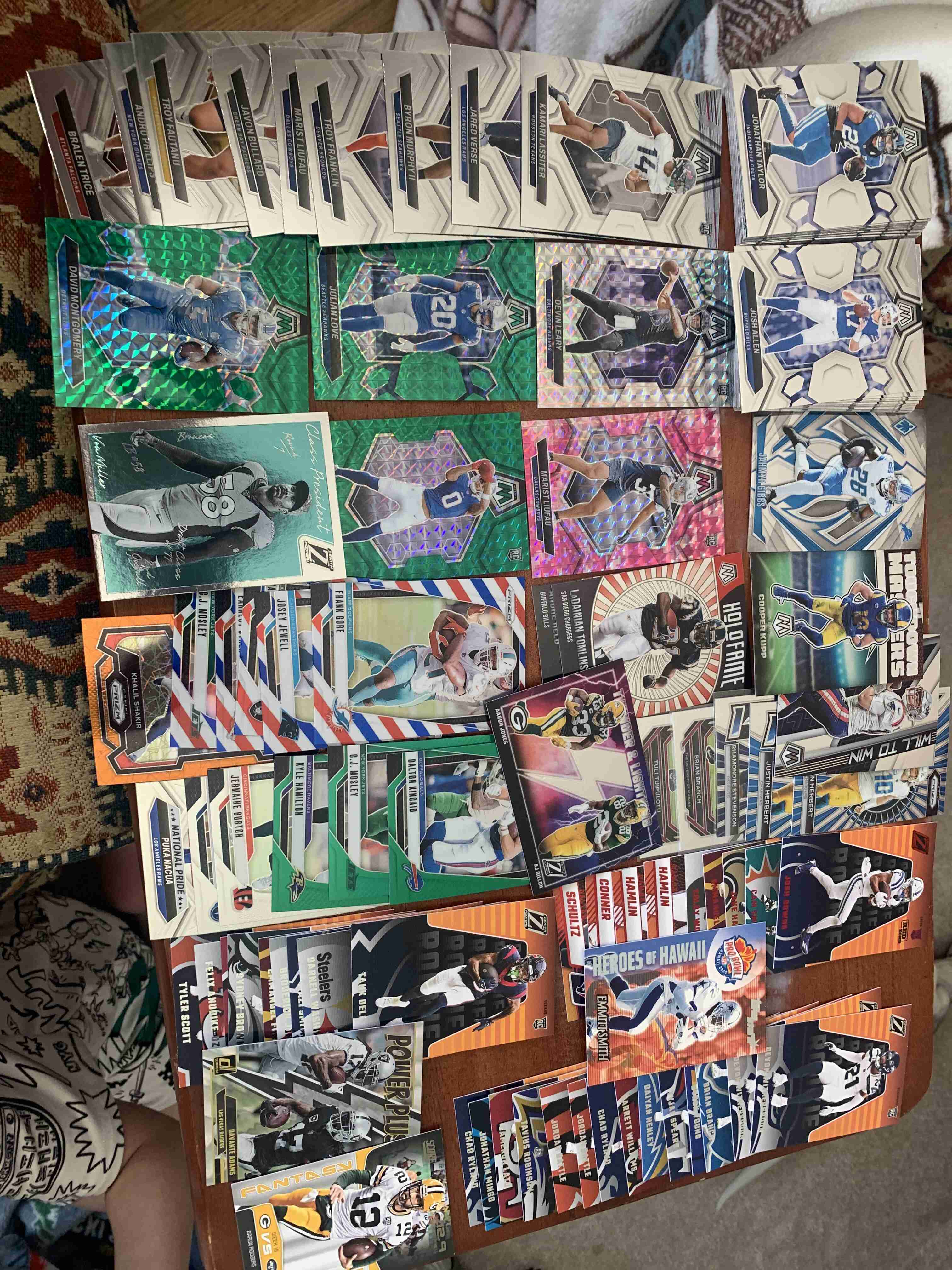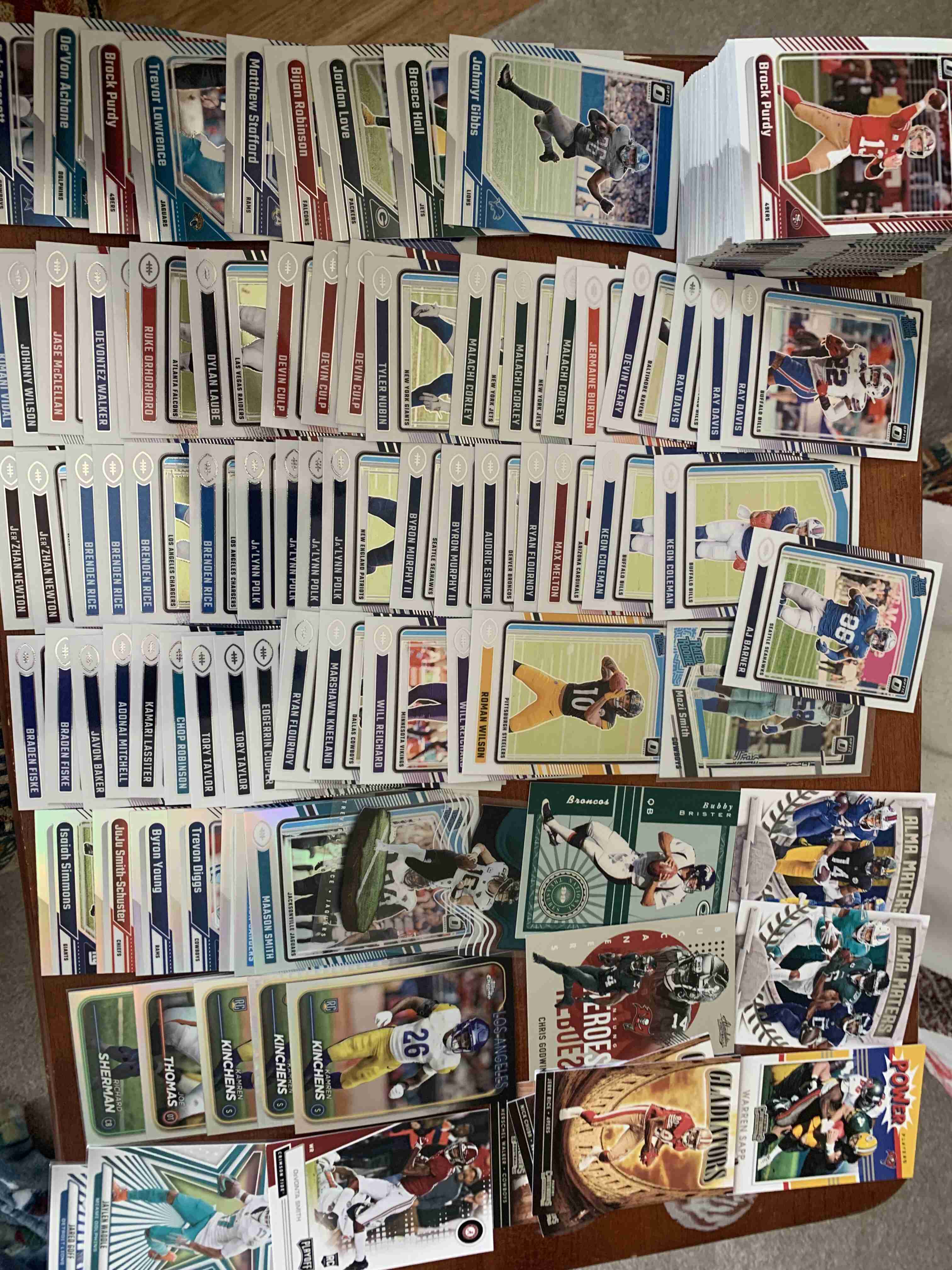 Awesome lot almost all newer stuff , great shape great resale tons of stars , base, prizms,mosaic rcs .Just to name a few Emmitt, Purdy, Mahomes, Chase , Burrow, Josh Allen, Jefferson, J Taylor , Achane, Smith-Njigba, Puka, Gibbs, StBrown, Mayfield, Evans ,Gibbs, Geoff. Plus tons more , Happy Bidding !