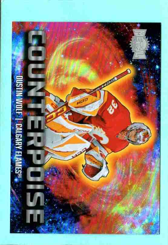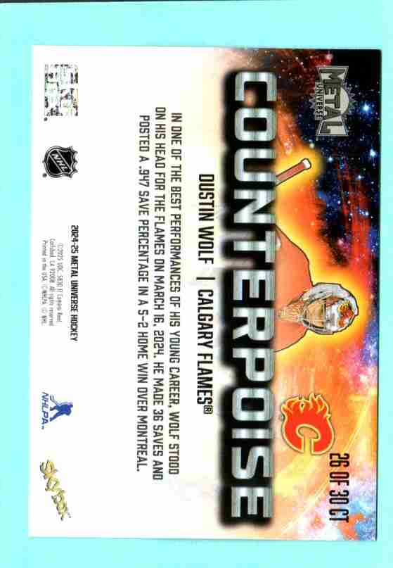 Featuring Dustin Wolf of the Calgary Flames, this Counterpoise insert (26 of 30) stands out with its vibrant cosmic foil design and strong visual impact—one of the more eye-catching inserts in Metal Universe.