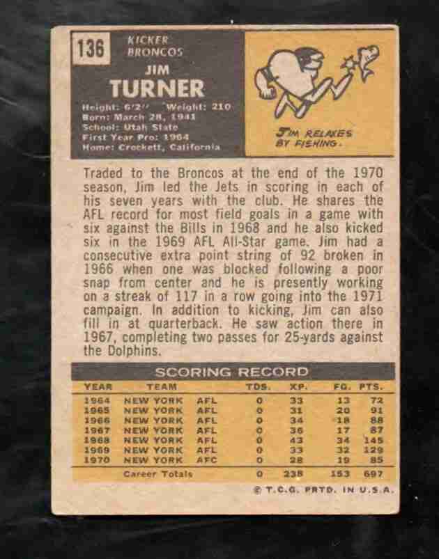 1971 Topps # 136 JIM TURNER Broncos EX+