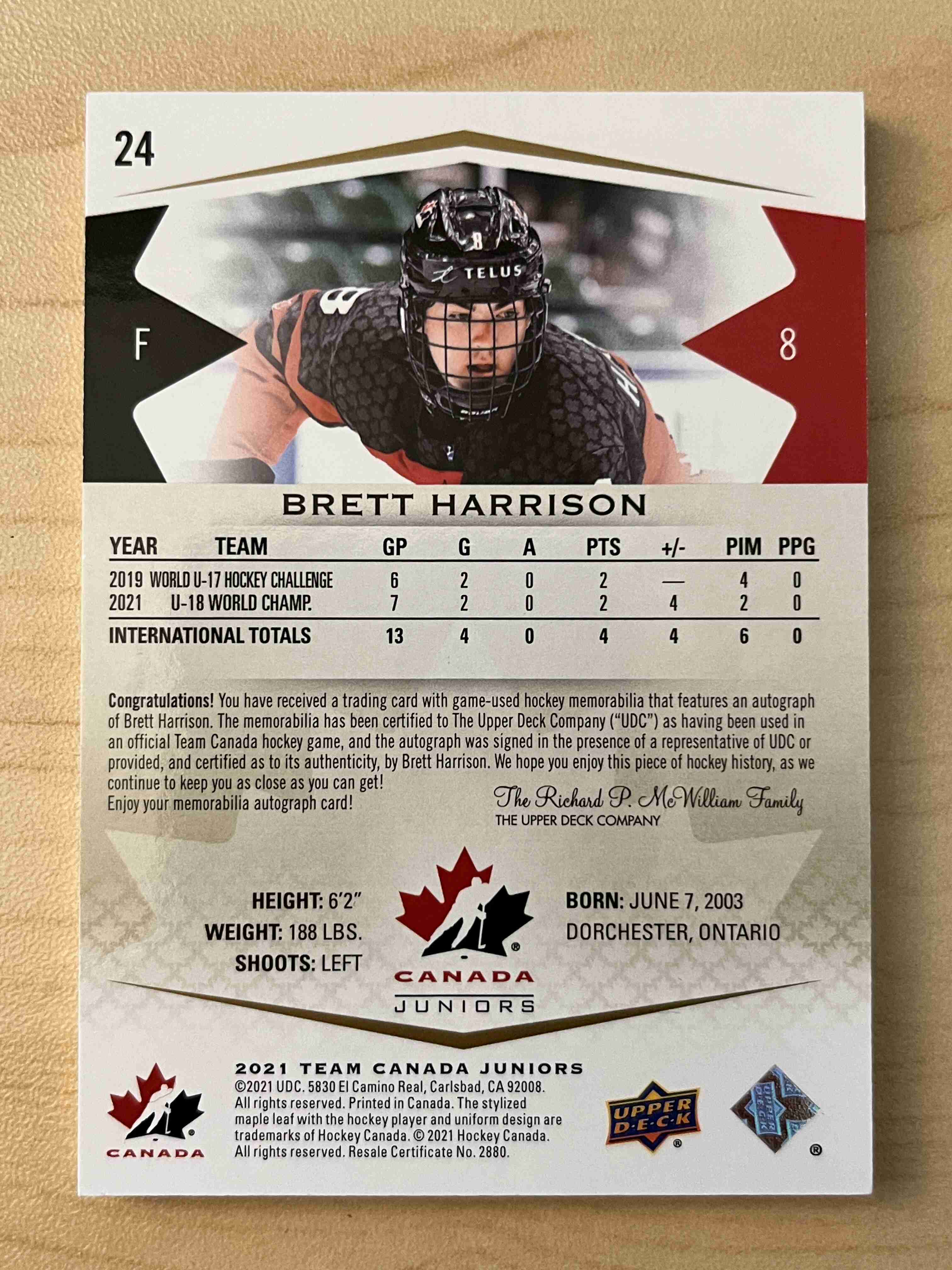 Brett Harrison 2021 Team Canada Juniors Premium Auto (#/199