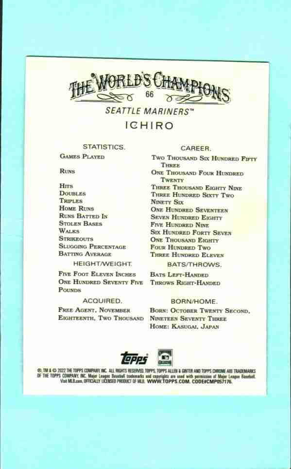 Ichiro #66 2022 Topps Allen & Ginter Seattle Mariners