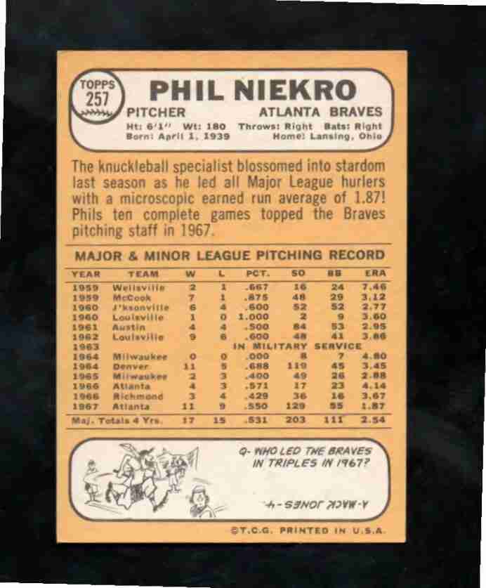 1968 Topps # 257 HOFer PHIL NIEKRO Braves