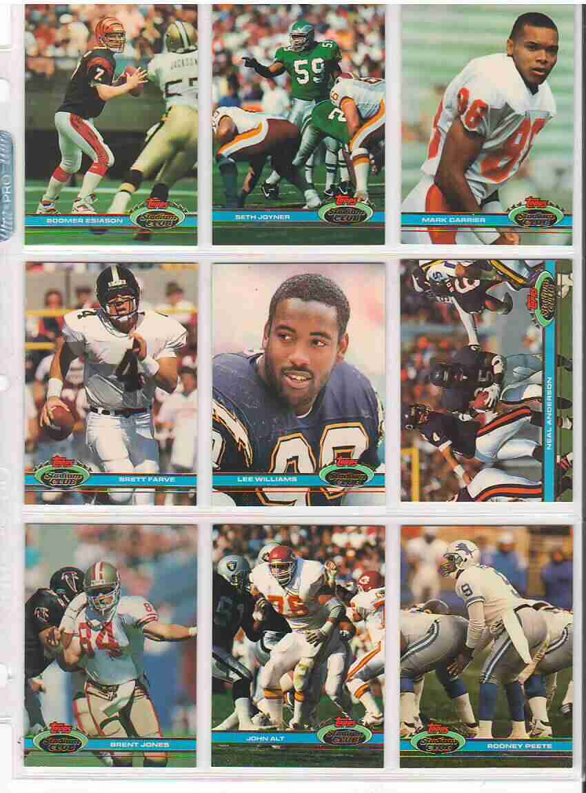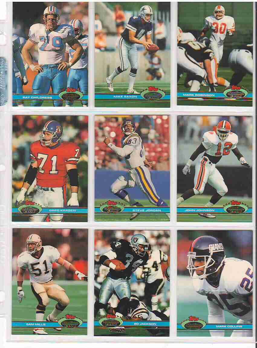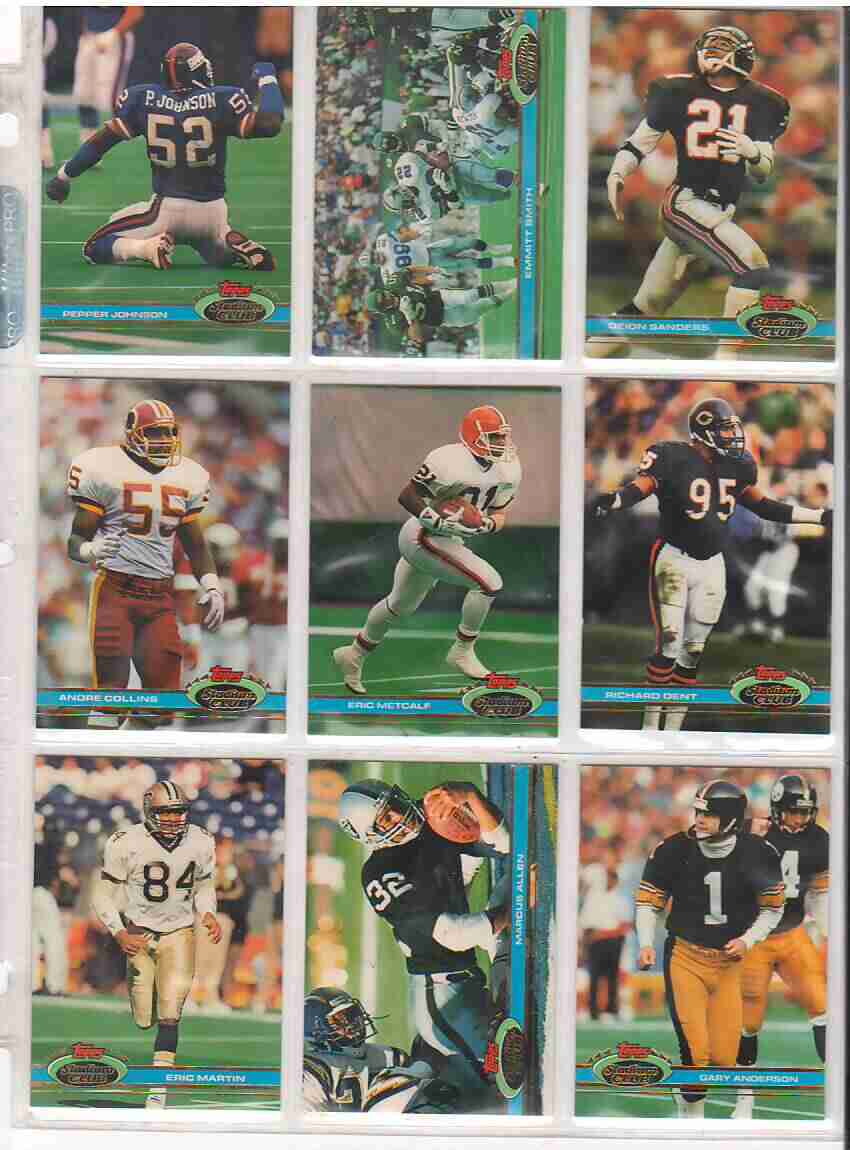 1991 Stadium Club Football Complete Set 1-500. Will be shipped in binder. I hand collated these back in 1991. Card are near mint to mint or better. I tried to include key cards in the photos. If you have any questions feel free to ask. I can supply pictures on request. Thanks for looking.