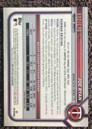 2022 Bowman Chrome JOE RYAN #8, RC Blue Refractor #/150
