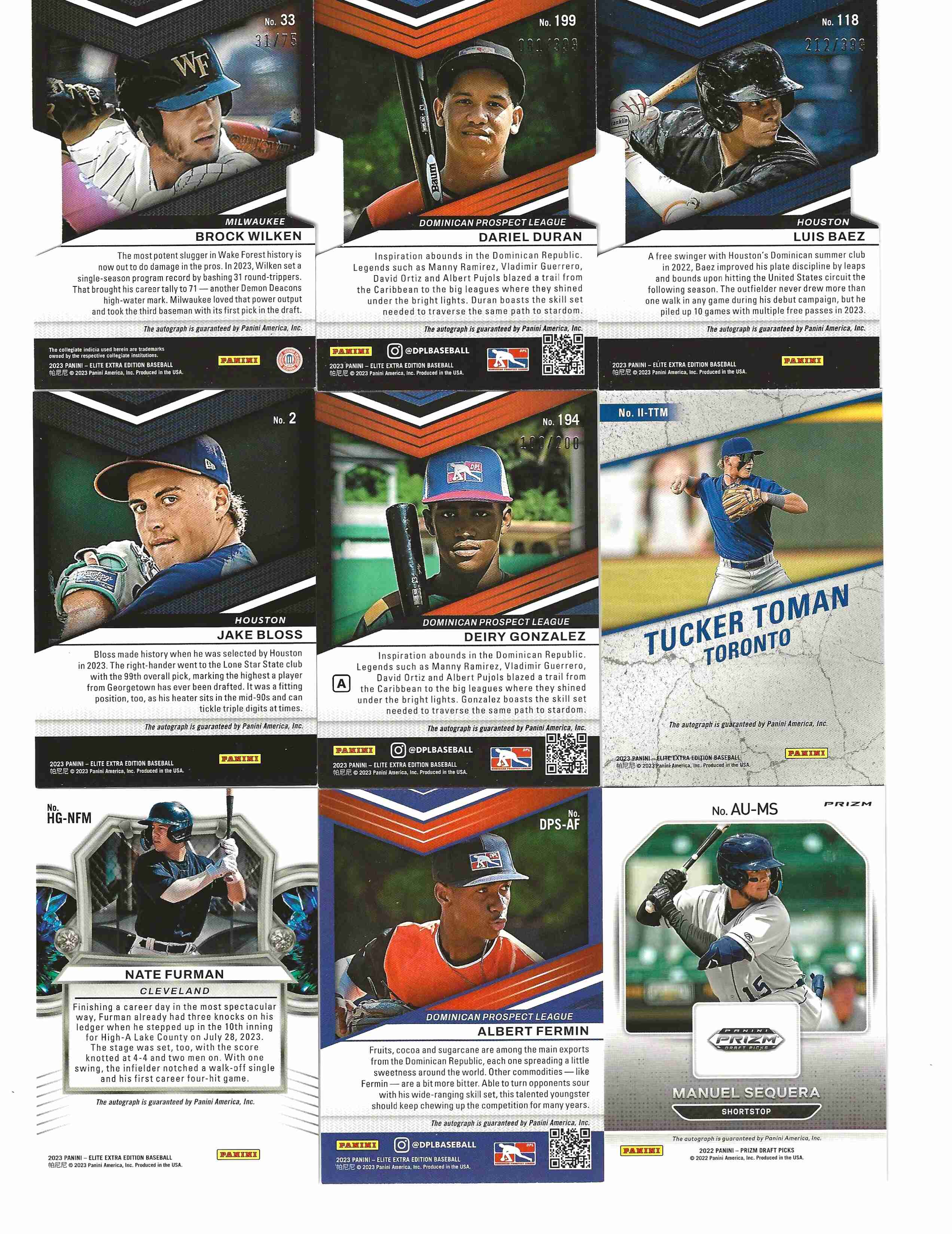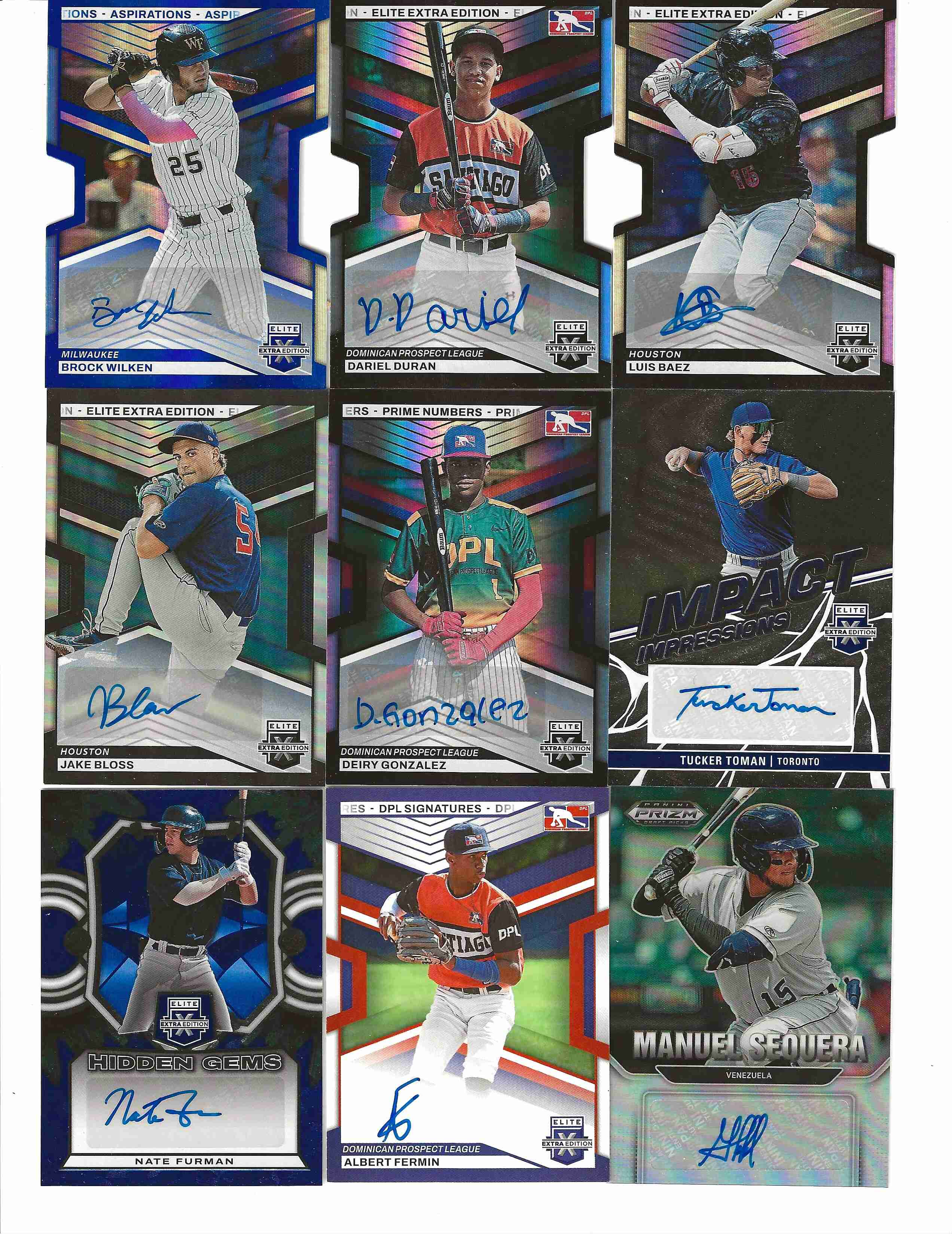 Lot contains 11 different autographed cards. Lot contains cards from Panini Prizm and Donruss Elite Extra Edition. 5 of the 11 cards are numbered between 50 and 399. Contains many young and up and coming minor leaguers. Thanks for looking.