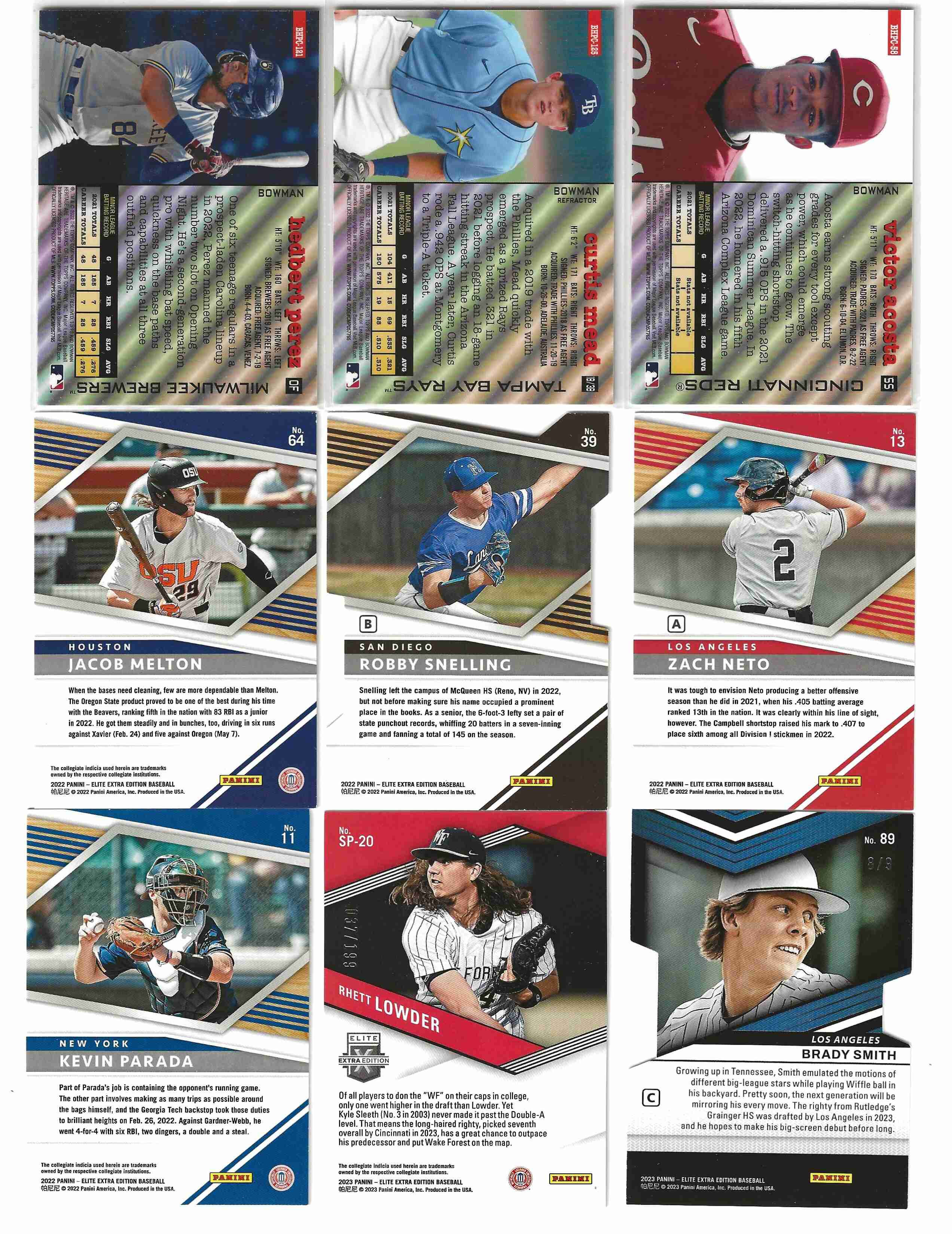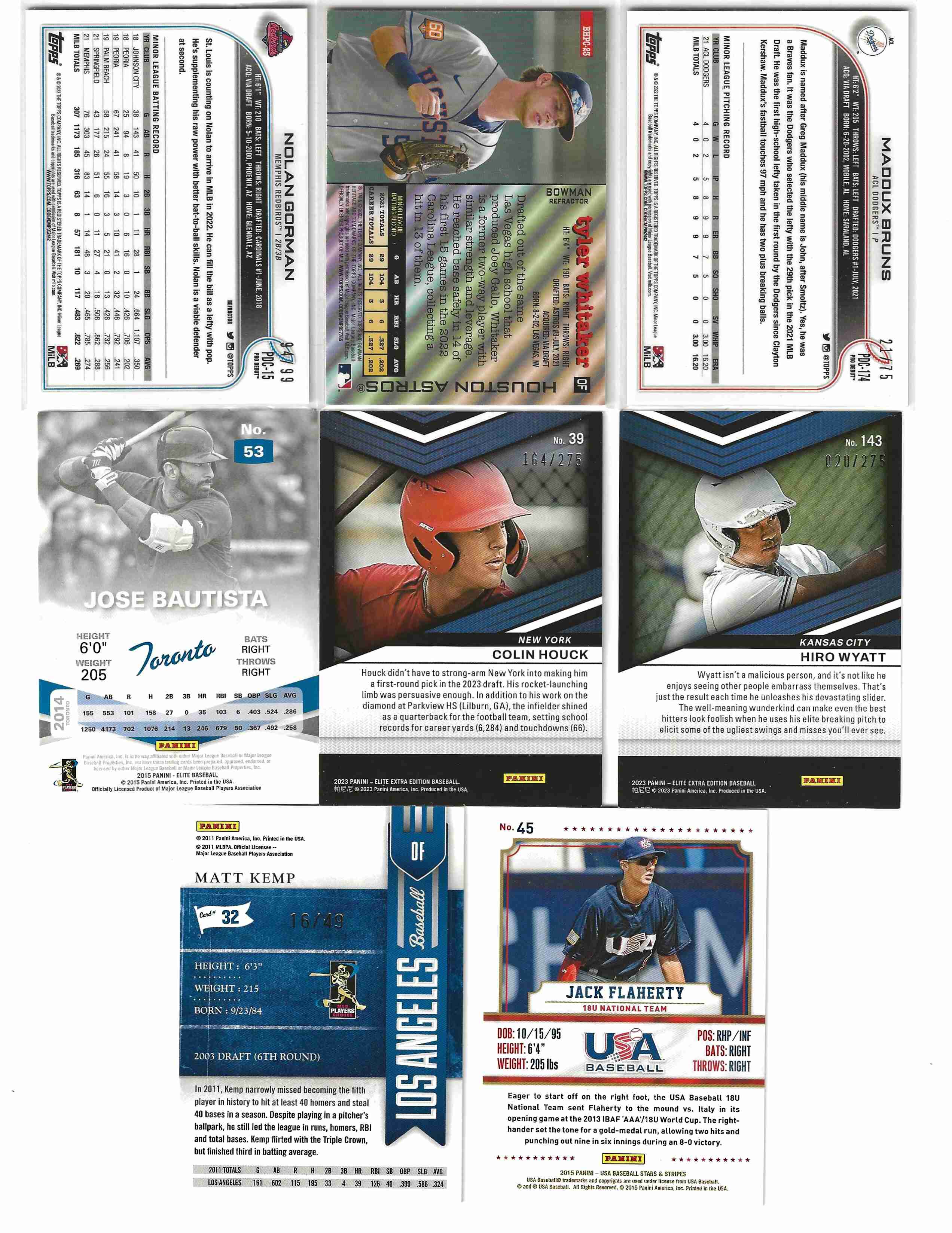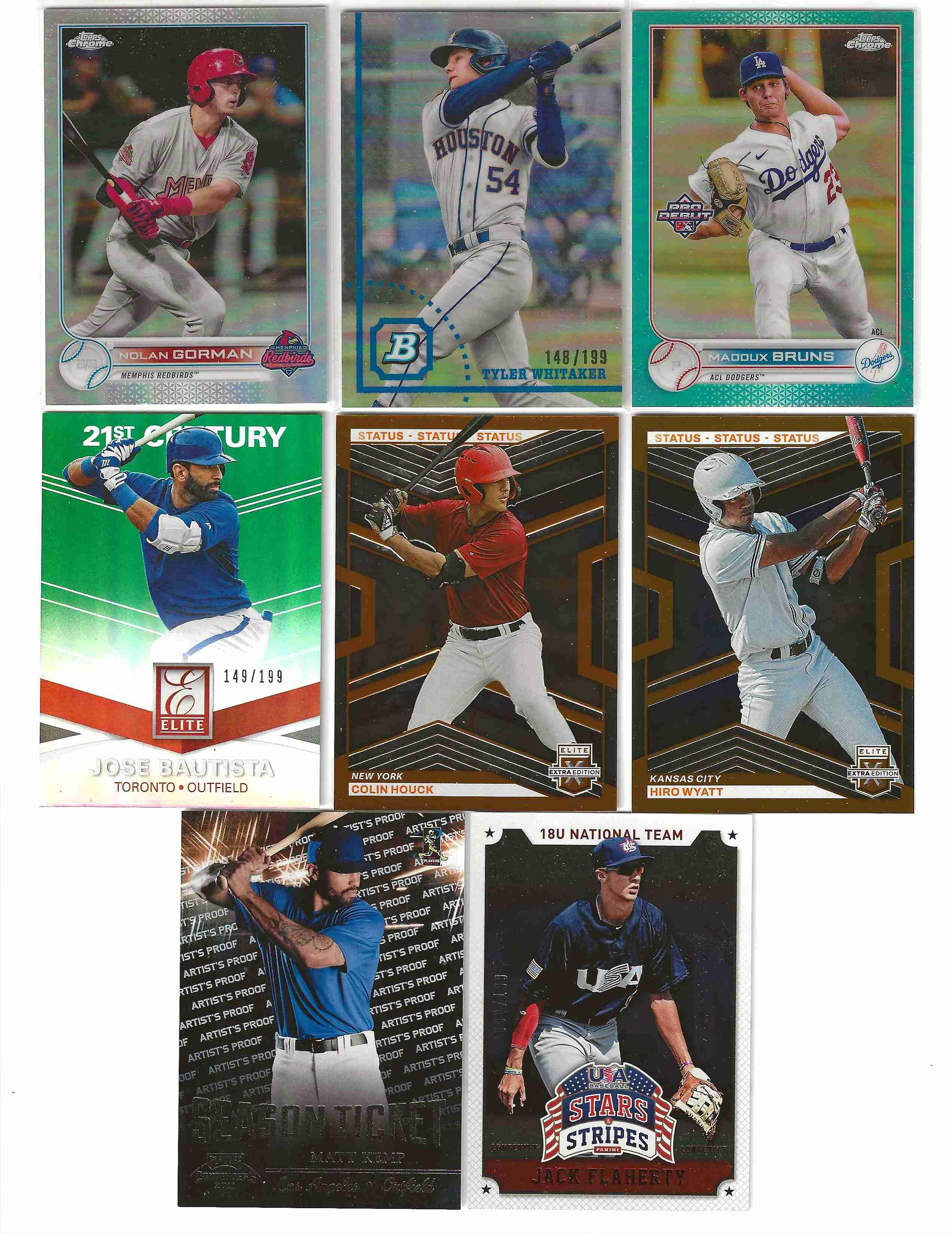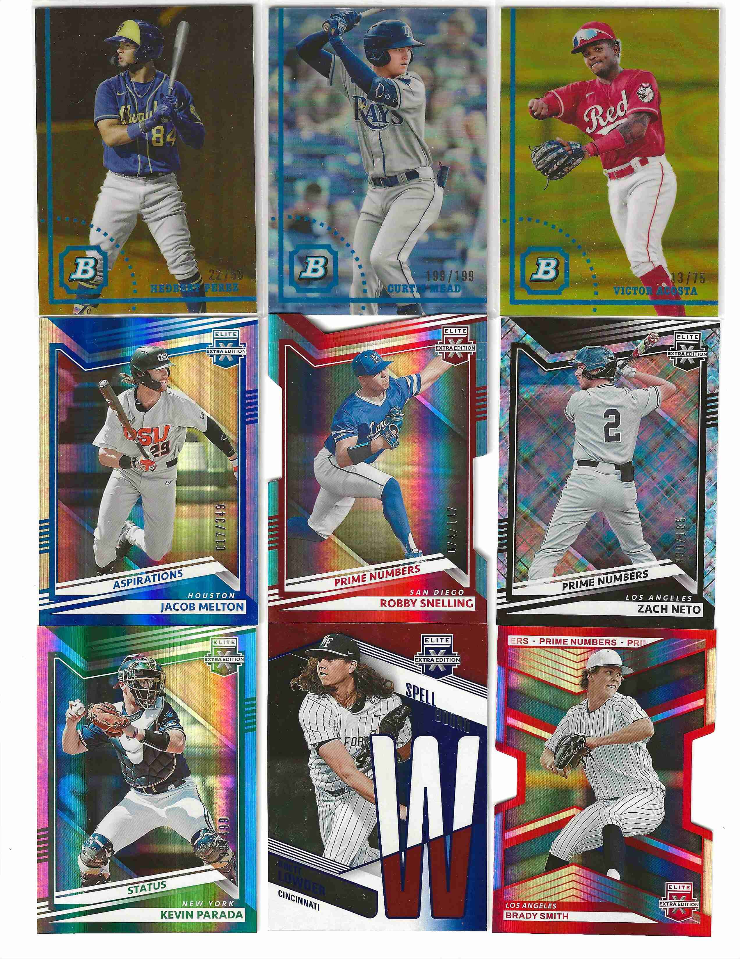 All cards in the lot are numbered. There are 10 cards that are numbered under 100 with 2 being numbered at 5 and 8. There are 17 cards numbered between 147 and 299. The remainder of the cards are numbered between 349 and 999 with 1 numbered at 1500. Most of the cards are of minor leaguers with a few being of current major leaguers. Thanks for looking.