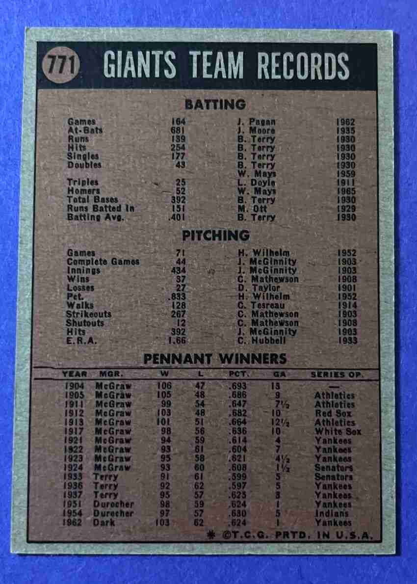 72 Topps GIANTS TEAM Hi #771 HOFx3!