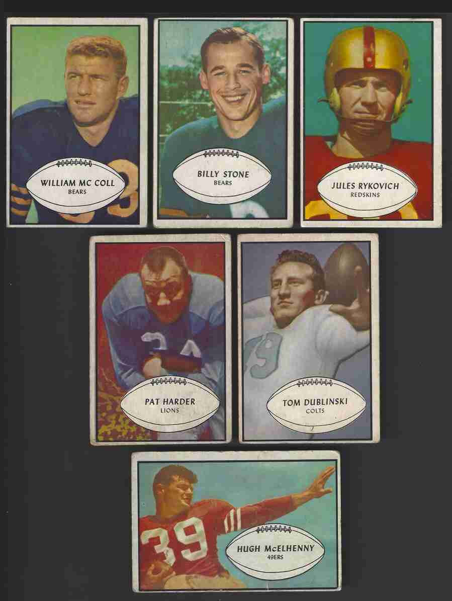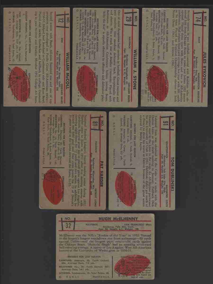 1953 Bowman Football Lot (6). No's-12,29,32(HOF),74,81(SP),91. Large lot of 1953 Bowman Football cards. Lot includes a scarce SP and Hall of Famer. Cards are in the mid to lower-grade range - corner wear, light crease/wrinkle. Decent shape for this era. Please review scans carefully for condition.