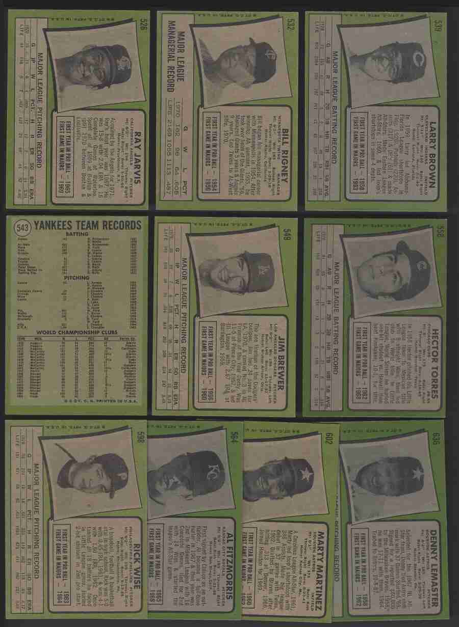 1971 Topps Baseball Lot (10) -Semi Hi No's-. No's-526,532,539,543,549, 558,598,564,602,636. Nice run of scarce semi-hi numbers from the 1971 Topps Baseball card set. Cards are in the higher-grade range. Cards have minor flaws. Nice shape for this condition-sensitive set. Nice lot to fill some numbers from this hard-to-find series. Please review scans carefully for condition.