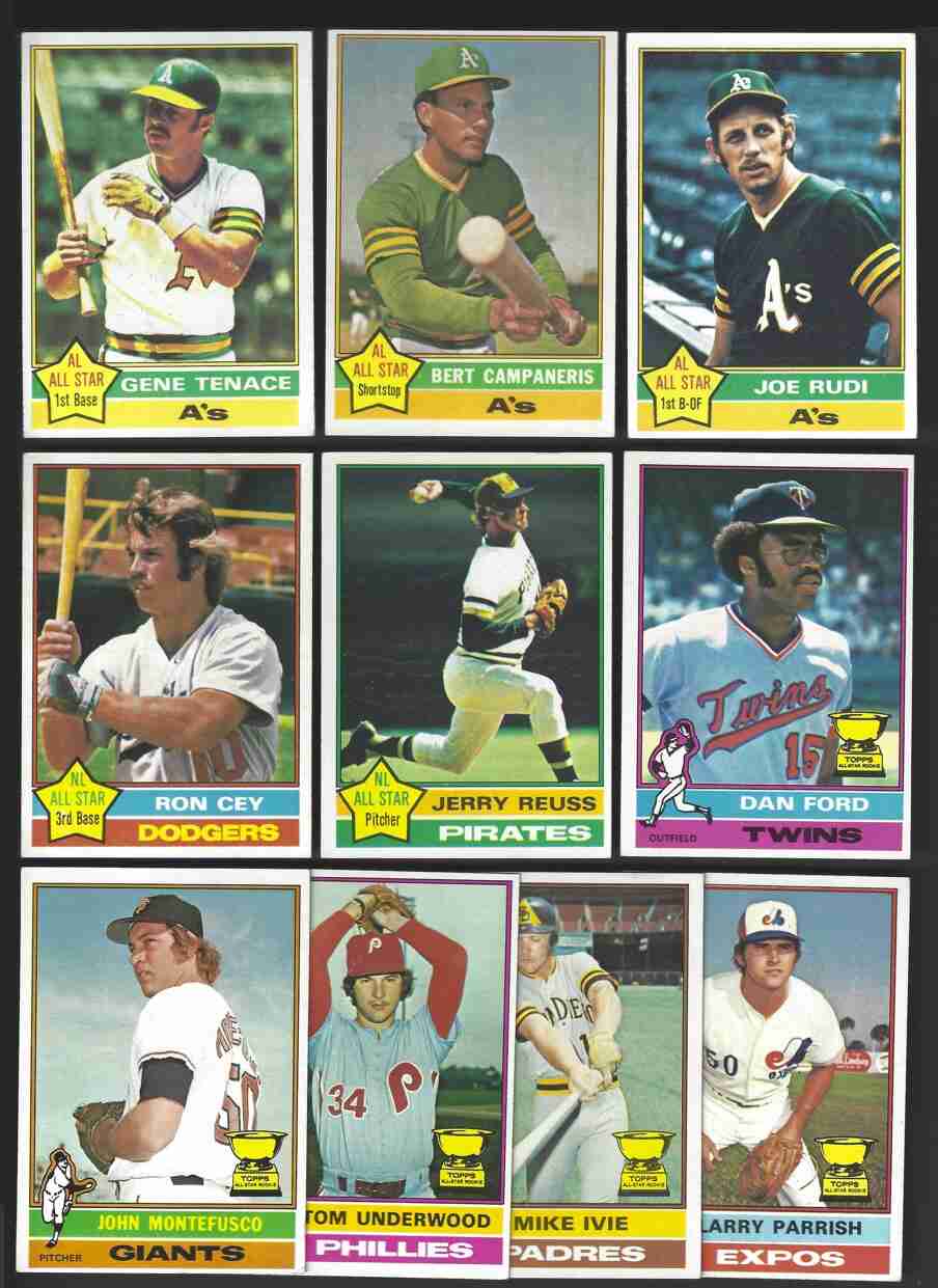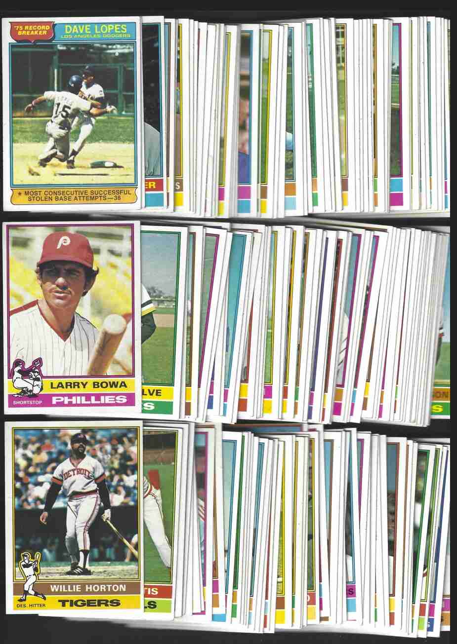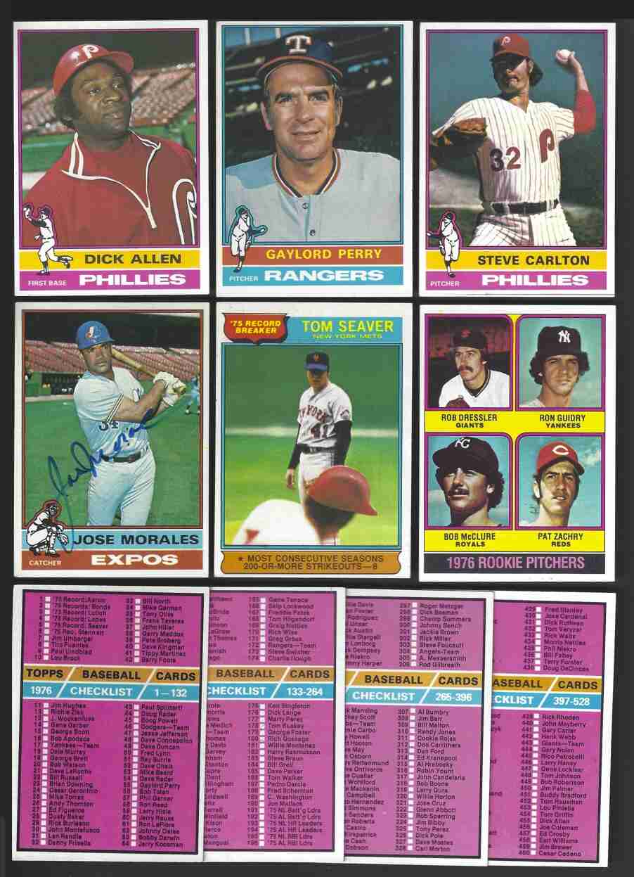 1976 Topps Baseball Lot (330) -High Grade-. Excellent large lot of 1976 Baseball cards. All different - half of the complete set! Lot includes Hall of Famers, All-Star's, All-Star Rookies, all of the Checklists - Unmarked, Semi-Stars, Rookies & (1) autographed card - Jose Morales. This is a high-grade lot. Cards have nice corners. Nice lot! Please review scans carefully for condition.