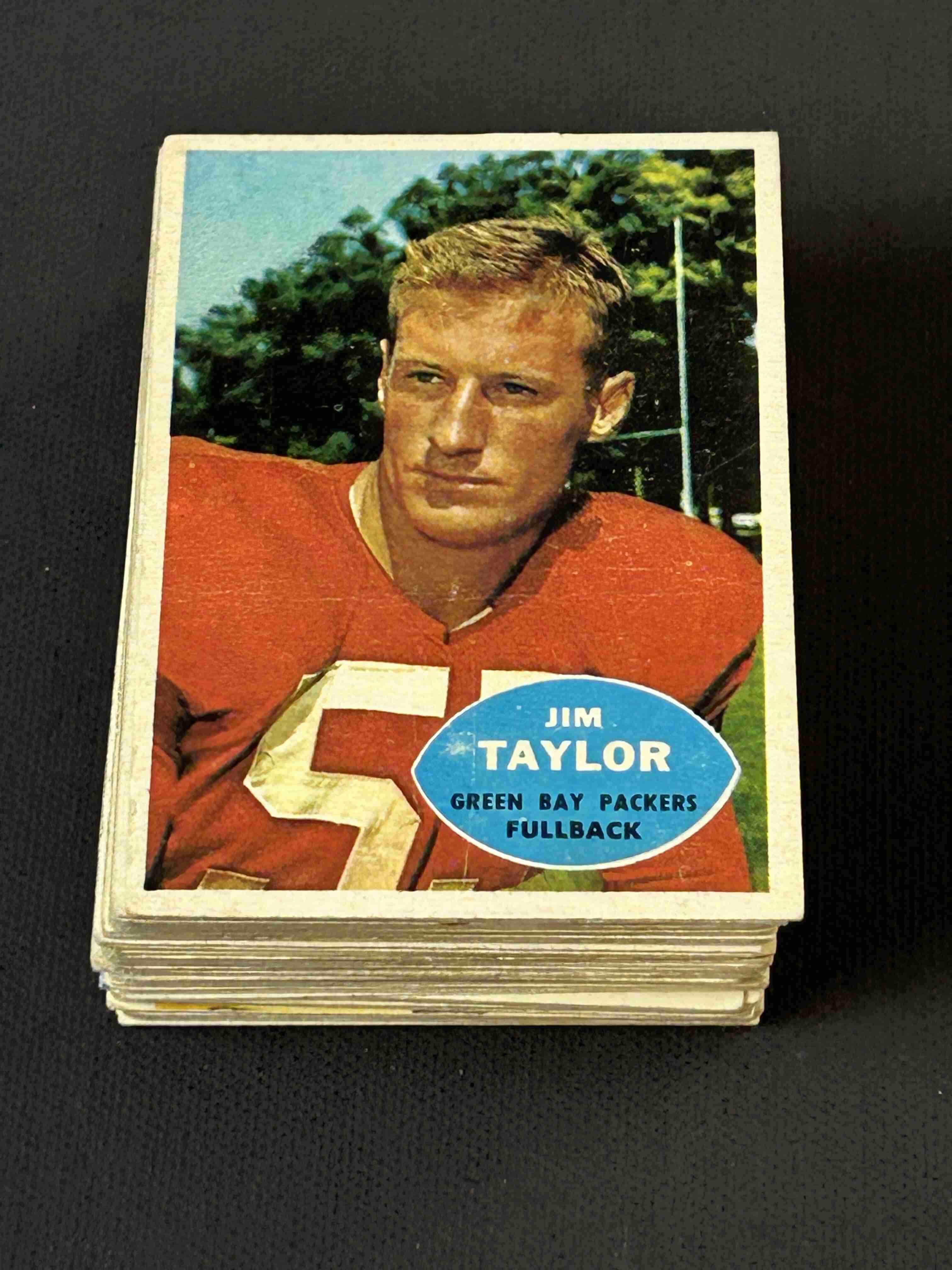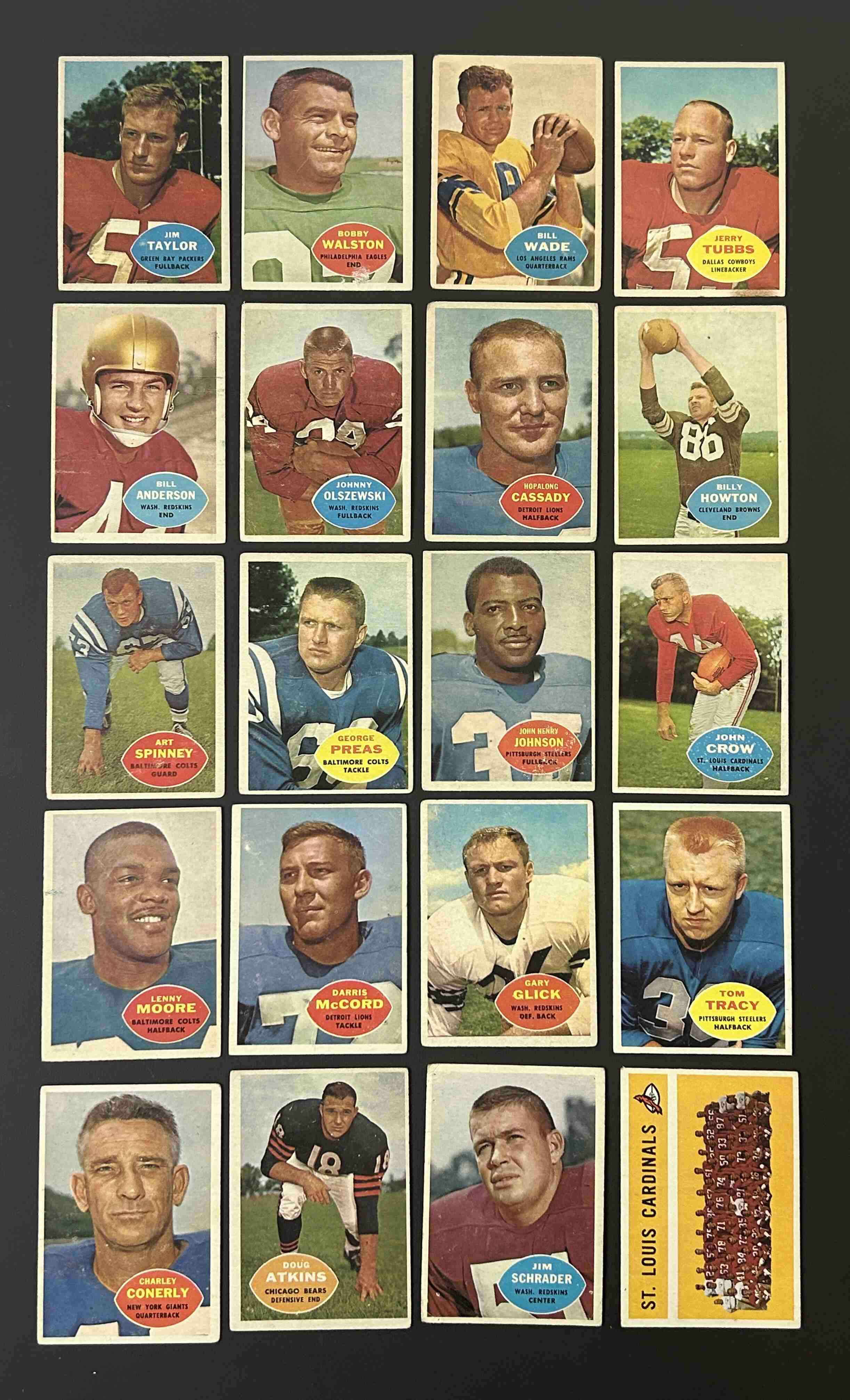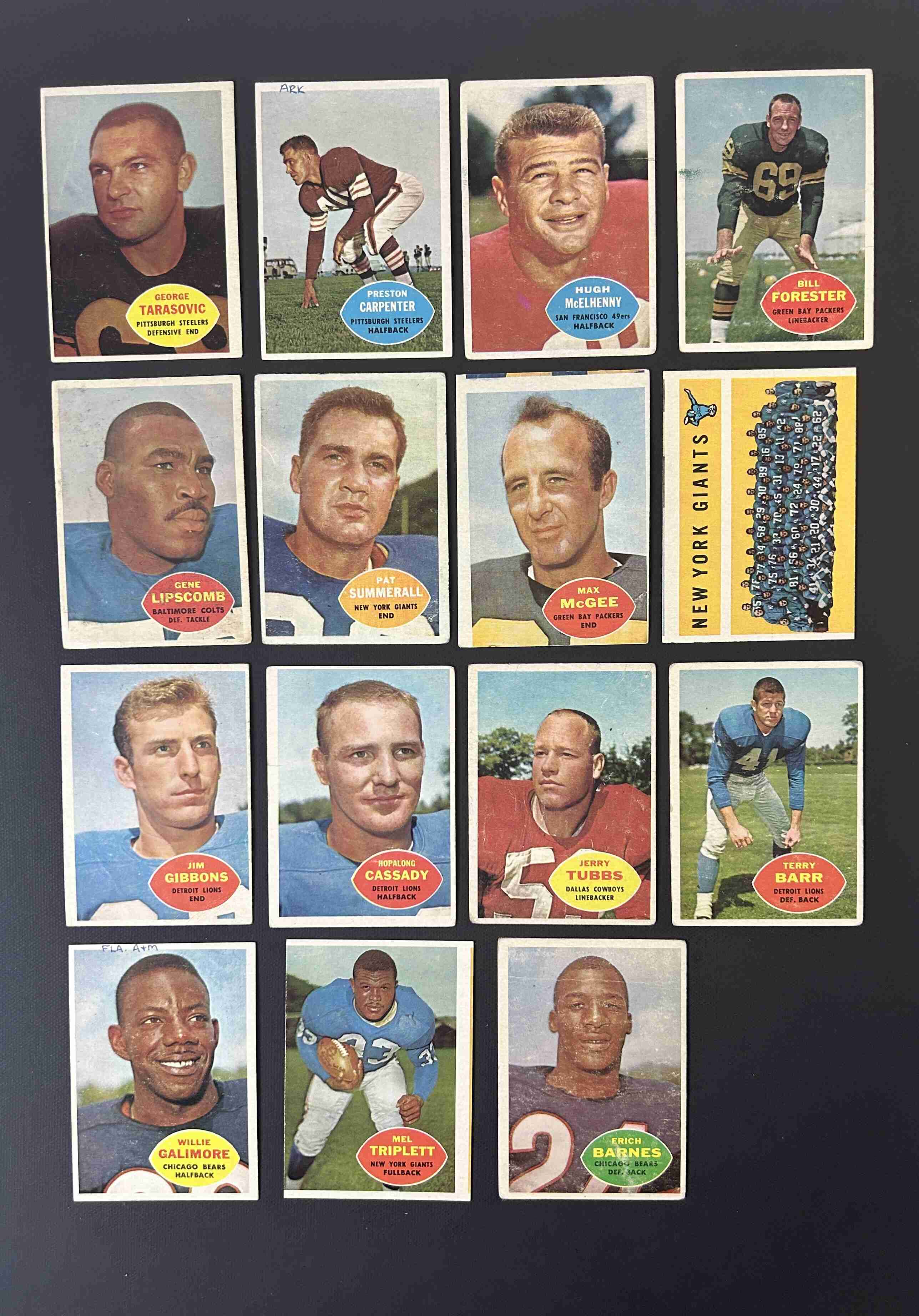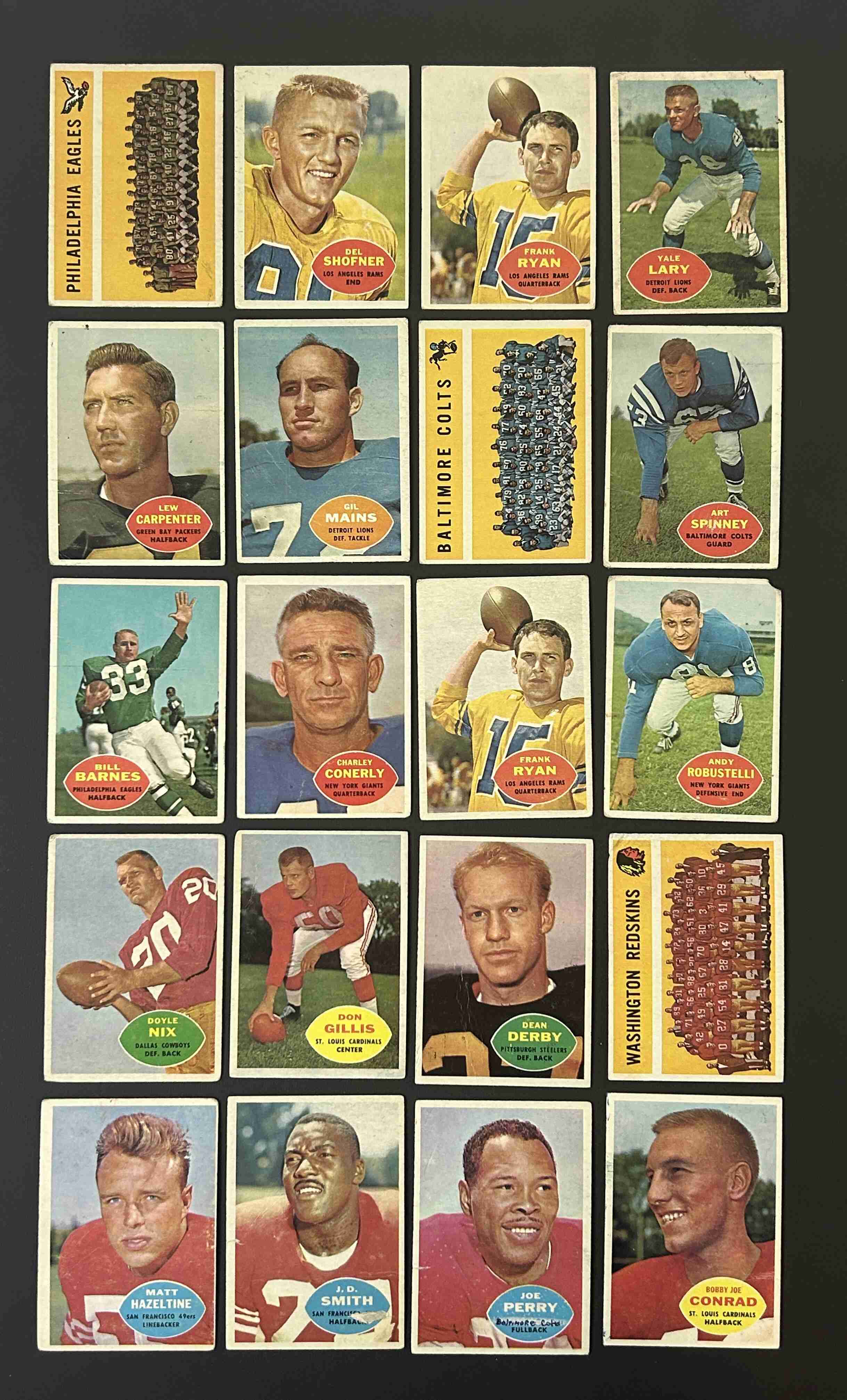 55 1960 Topps football. Low grade with condition ranging from Poor to Good. One card has a small tear. 2 have writing on the front and 4 have writing on the back. 2 of the 4 team cards are marked the other two checklists are not marked. Includes some stars and HOFers. #'s 3,6,7(2),10,11,19,20,27,38(2)