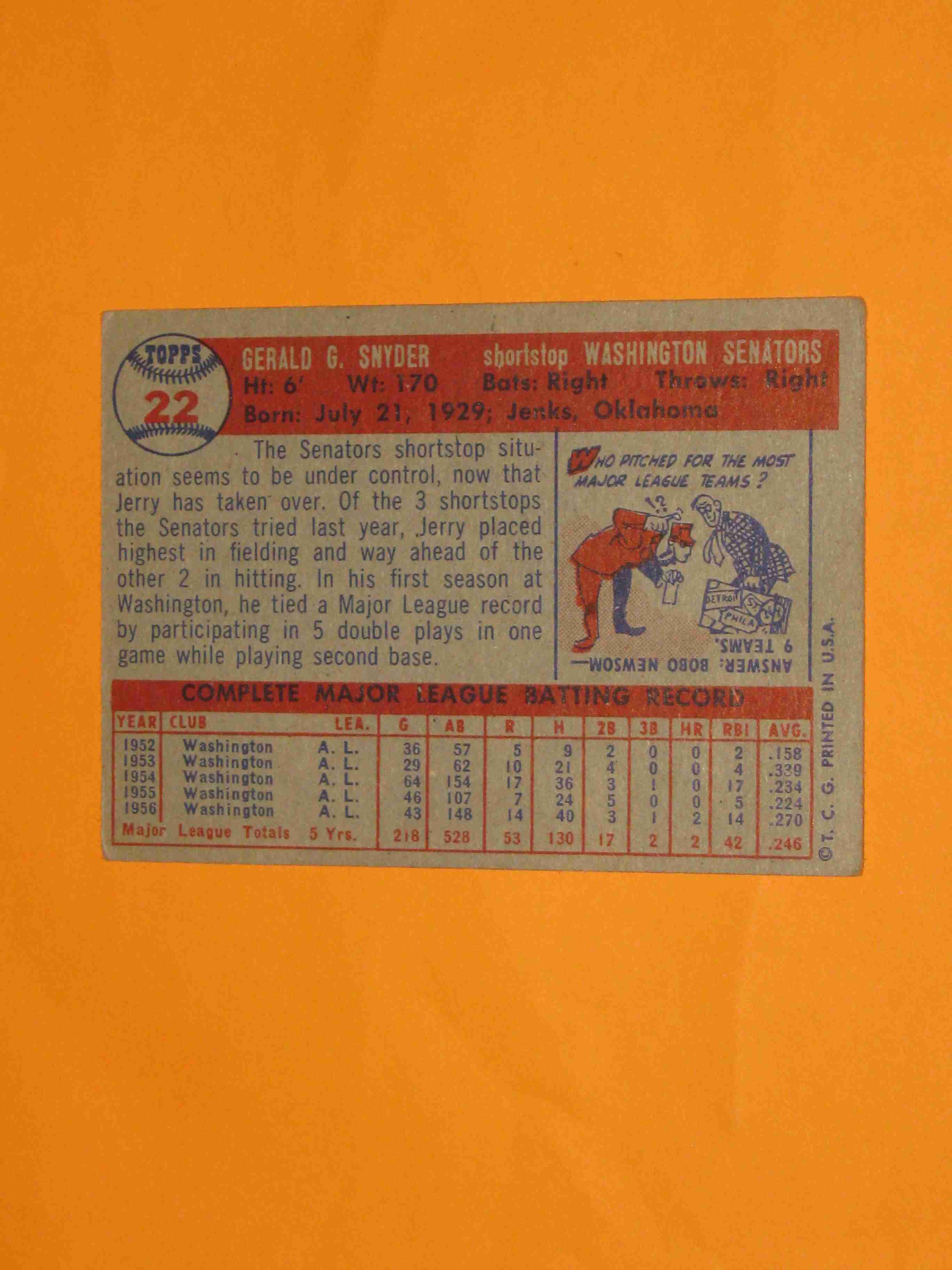 1957 Topps Jerry Snyder #22 Washington Senators