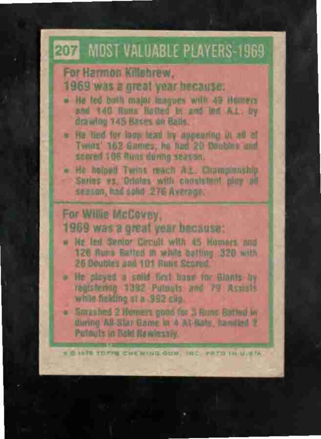 1975 Topps # 207 1969 MVPs KILLEBREW & McCOVEY