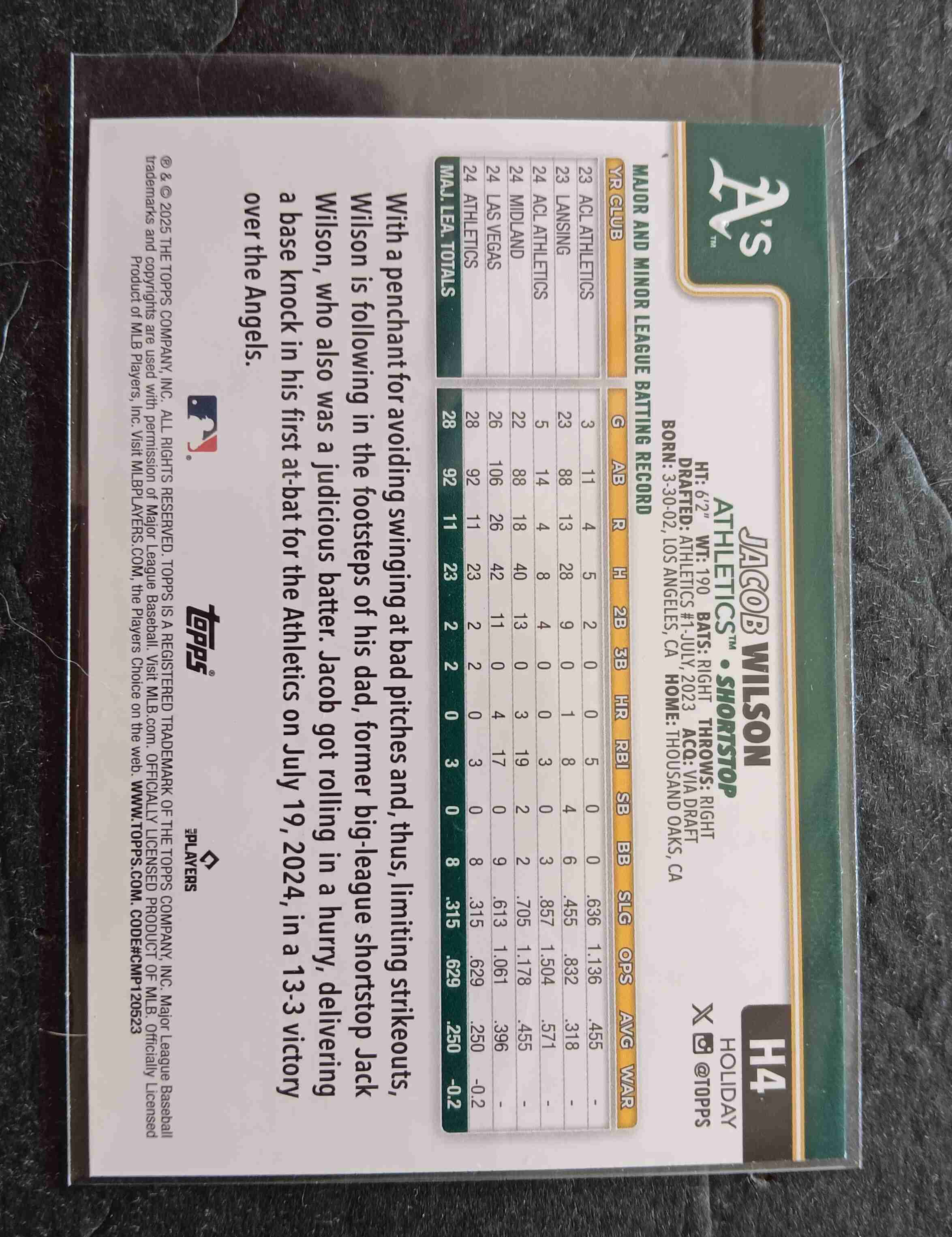 This auction is for a 2025 Topps Holiday Jacob Wilson Santa Hat Variation.Card is number #H4 and is in NM condition.Thanks for looking.