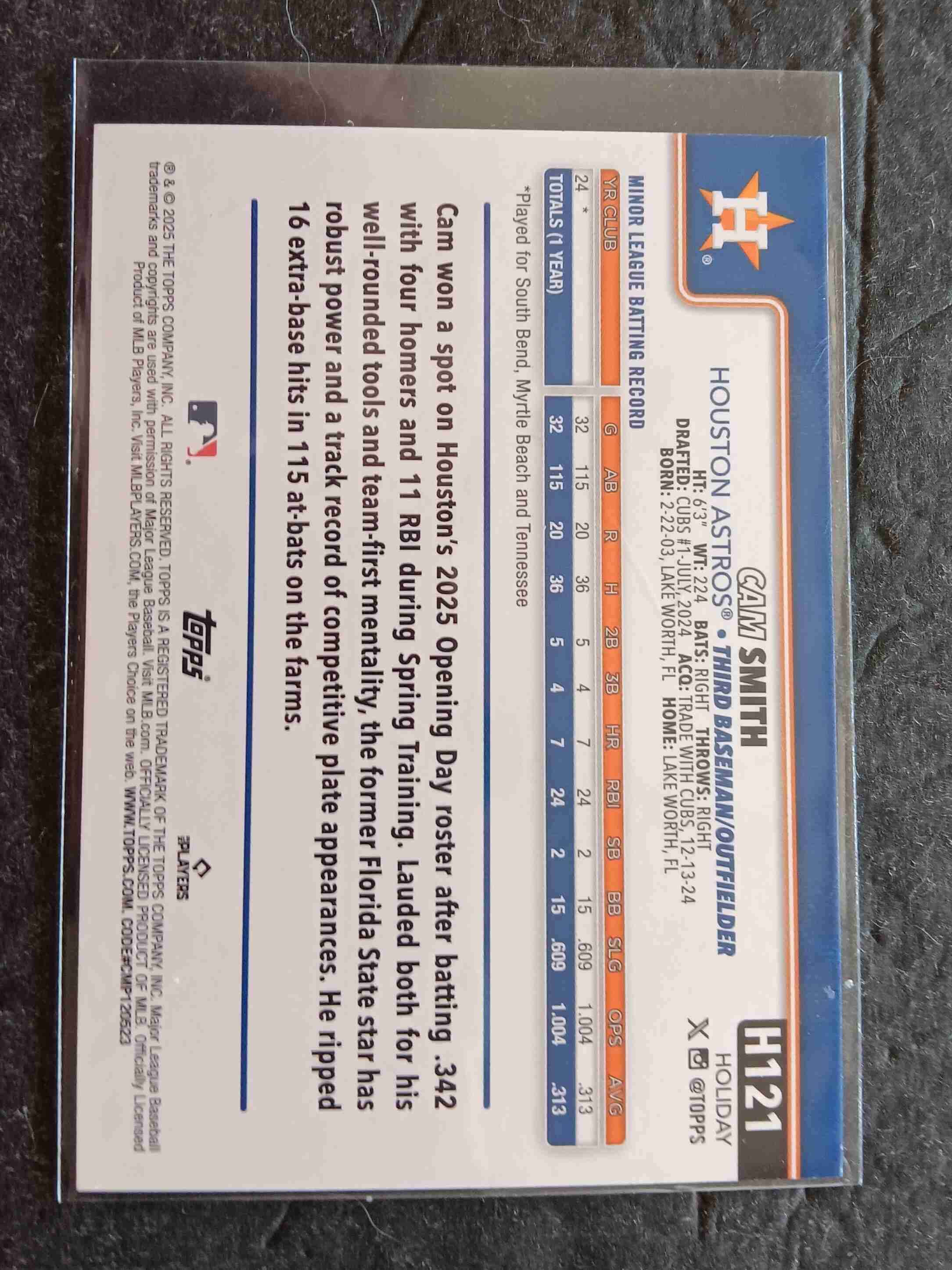 This auction is for a 2025 Topps Holiday Cam Smith Rookie Santa Hat Variation.Card is number H121,and is in NM condition.Thanks for looking.