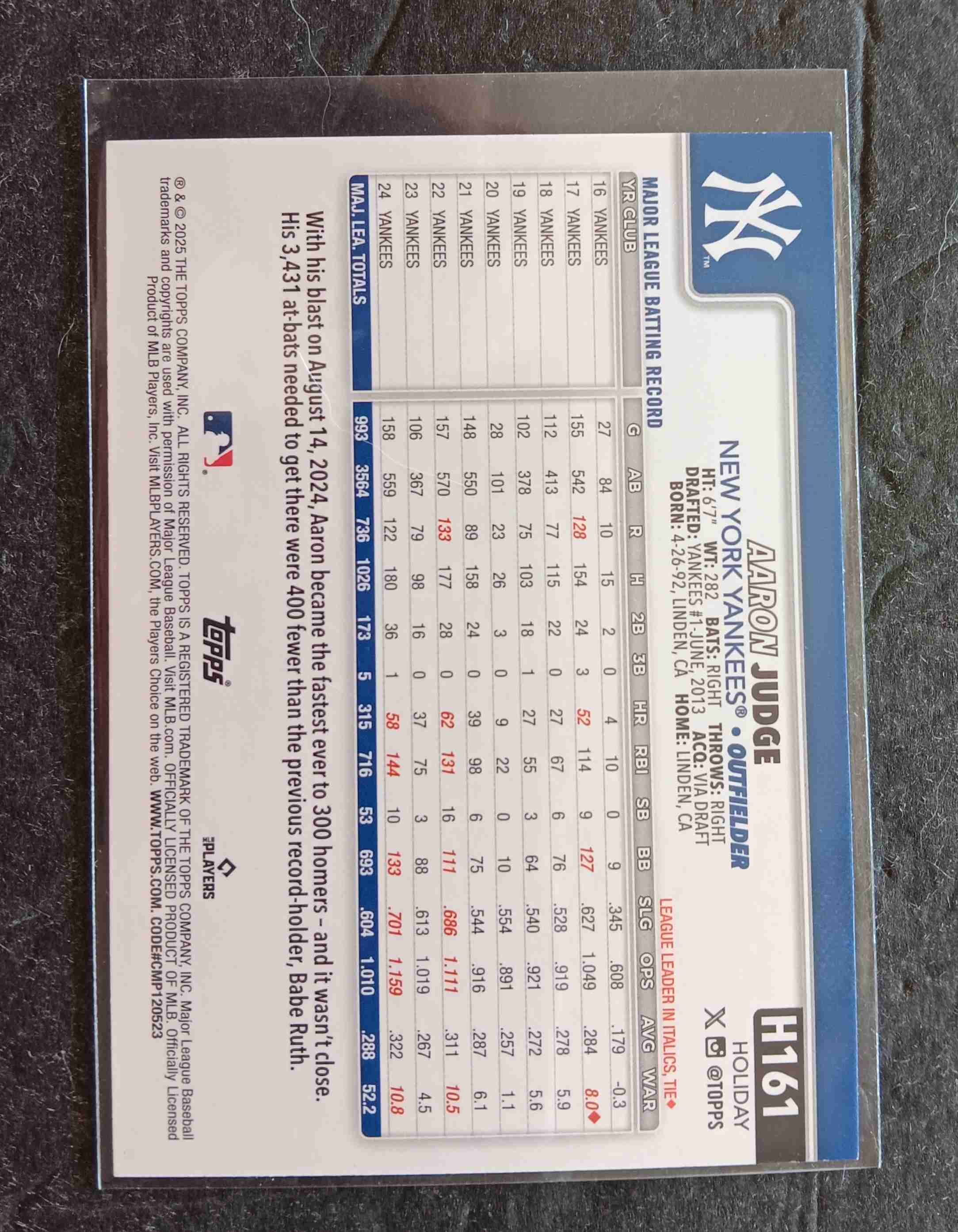 This auction is for a 2025 Holiday Aaron Judge Lights Wreath Parallel.Card is number #H161,and is in NM condition.Thanks for looking.