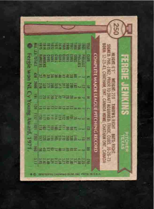1976 Topps # 250 FERGIE JENKINS Rangers