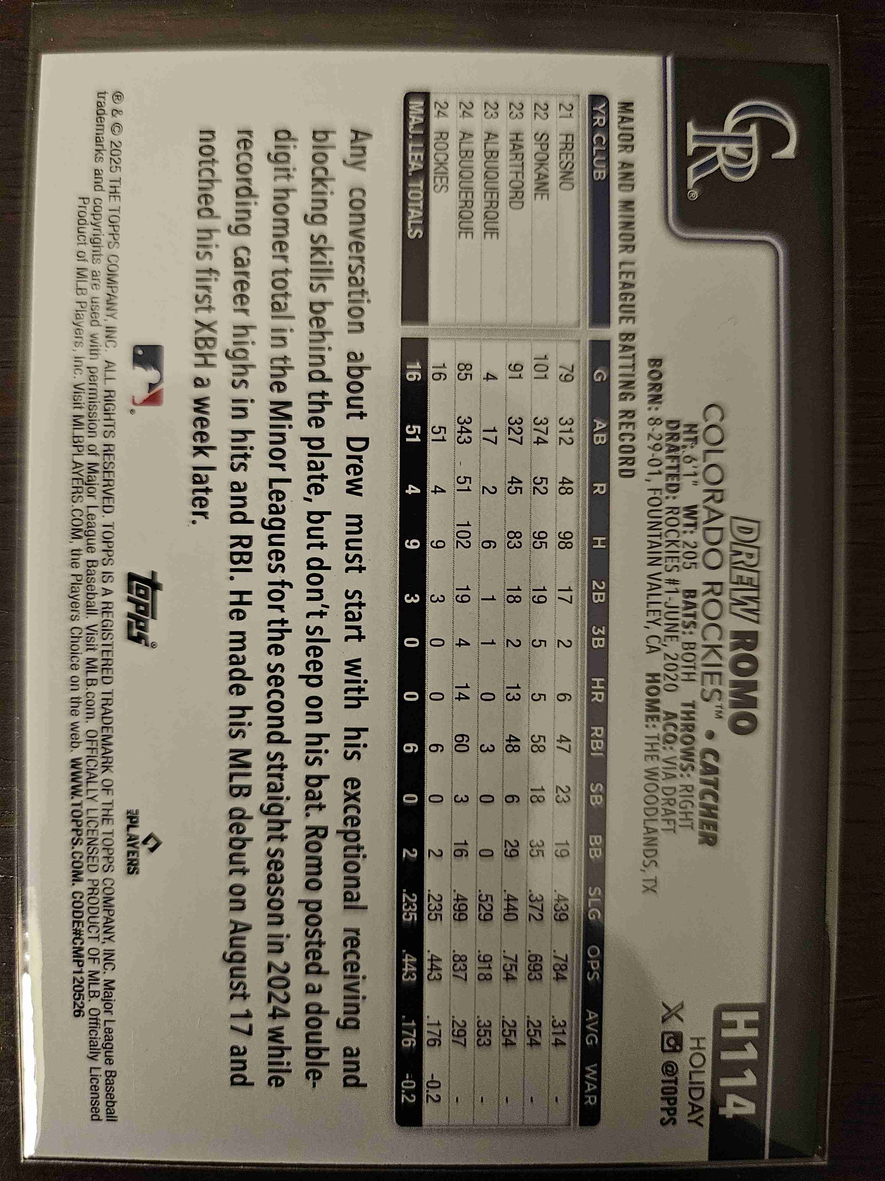 Drew Romo 2025 Topps Holiday Light Blue Glitter Rookie SP