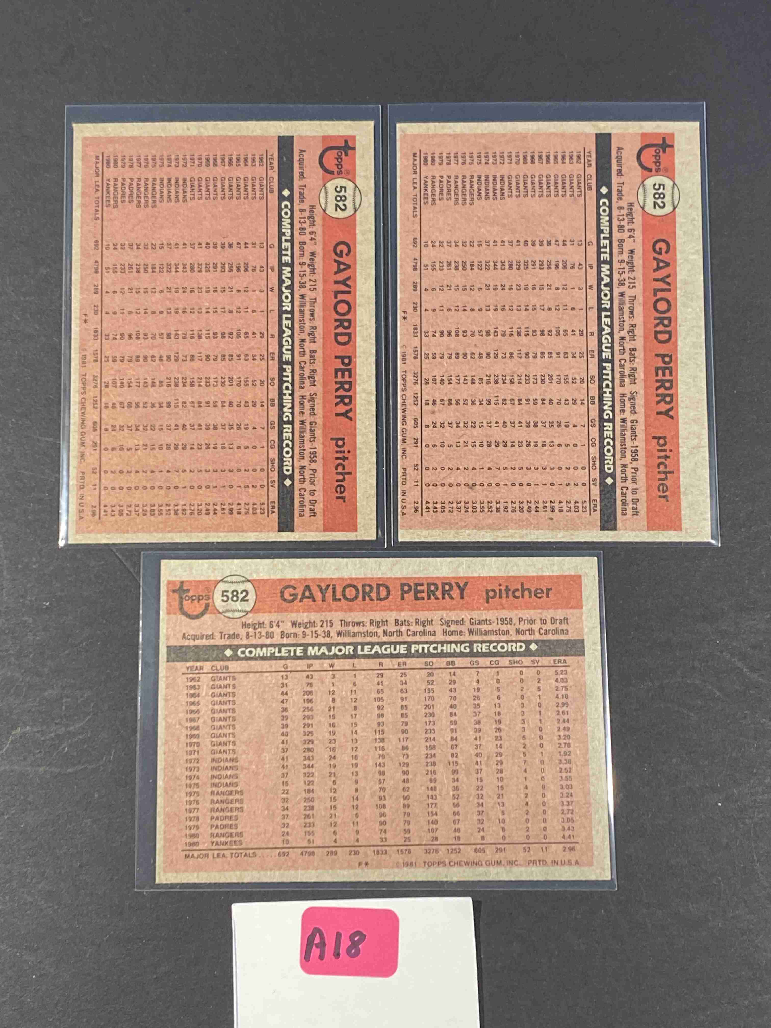Gaylord Perry 1981 Topps # 582 Lot of 3